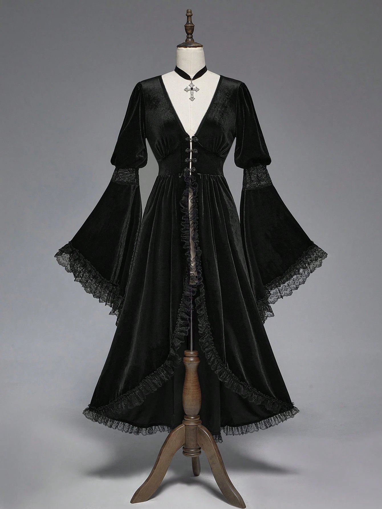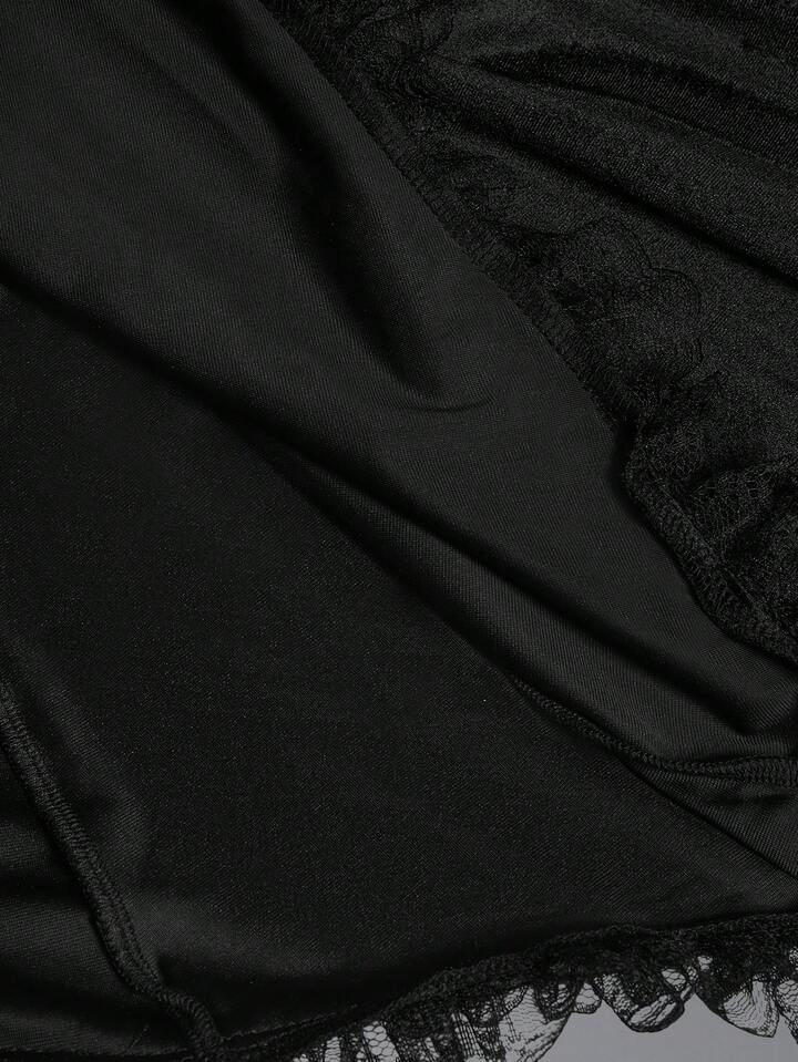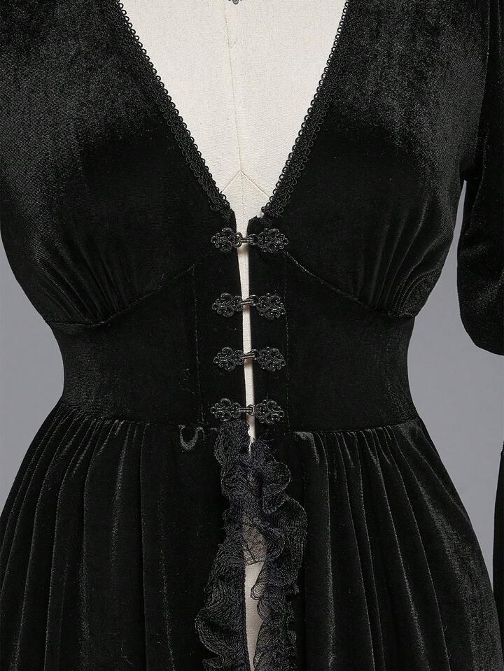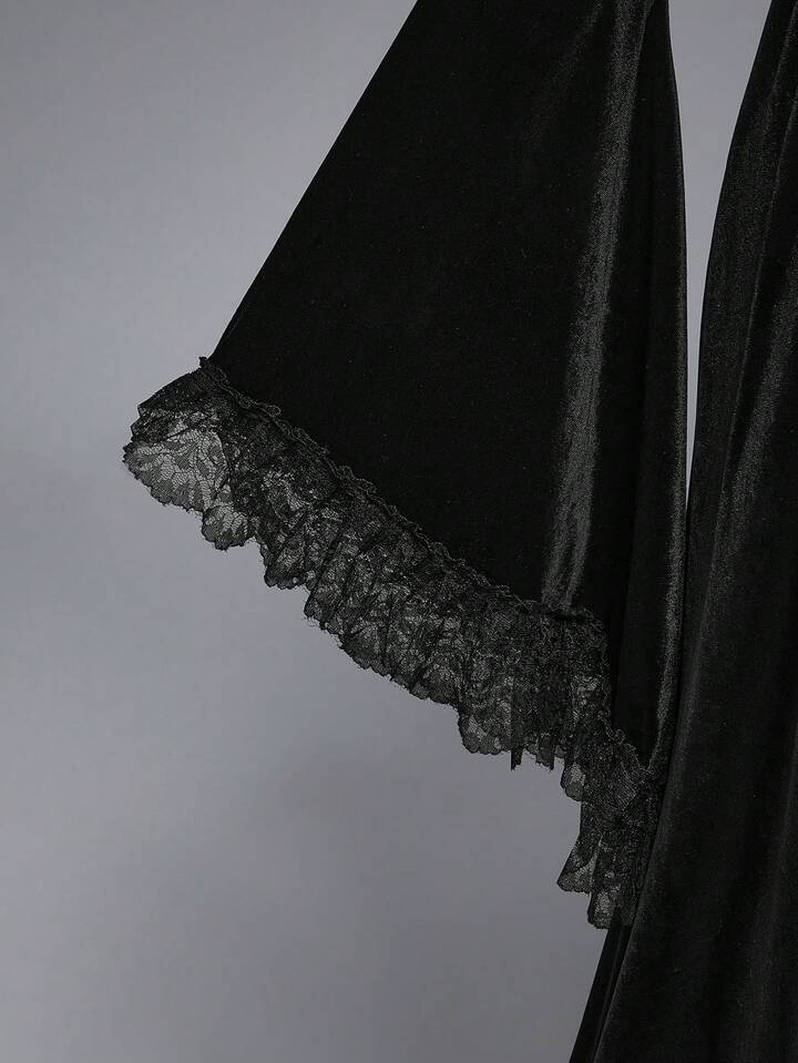 Goth Chaqueta ajustada con parches de encaje y terciopelo, cuello en V profundo, abertura alta y mangas acampanadas de estilo elegante y gótico de palacio