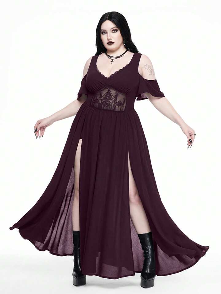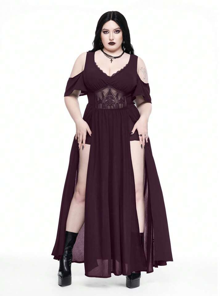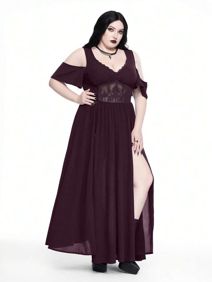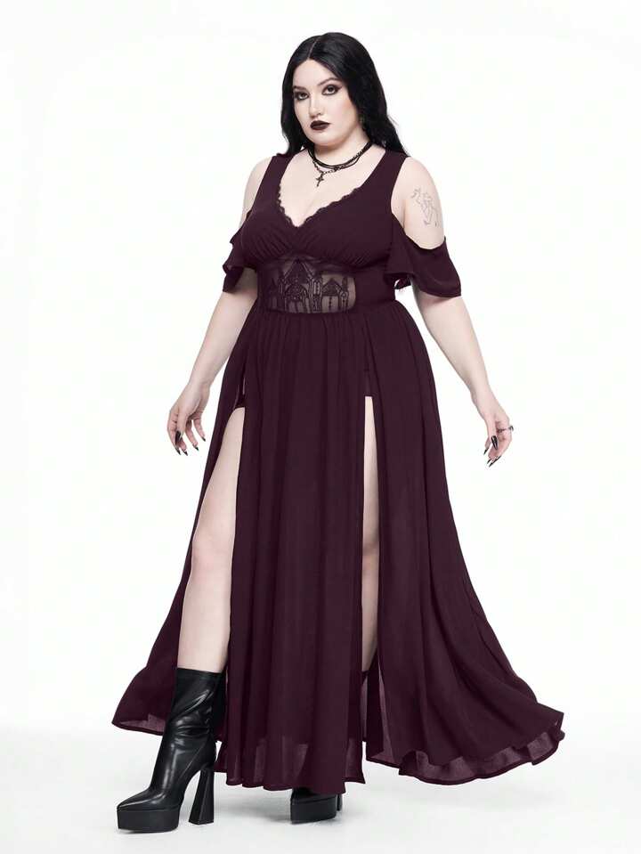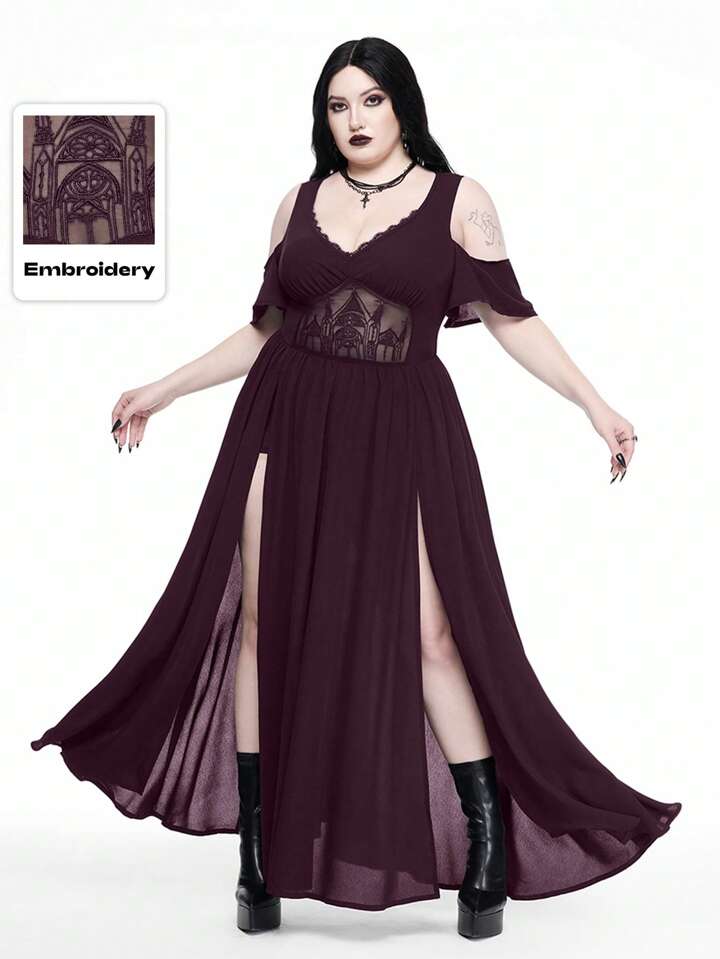 Goth Vestido de talla grande con escote profundo en V, hombros descubiertos, abertura alta y patrón calado bordado estilo gótico