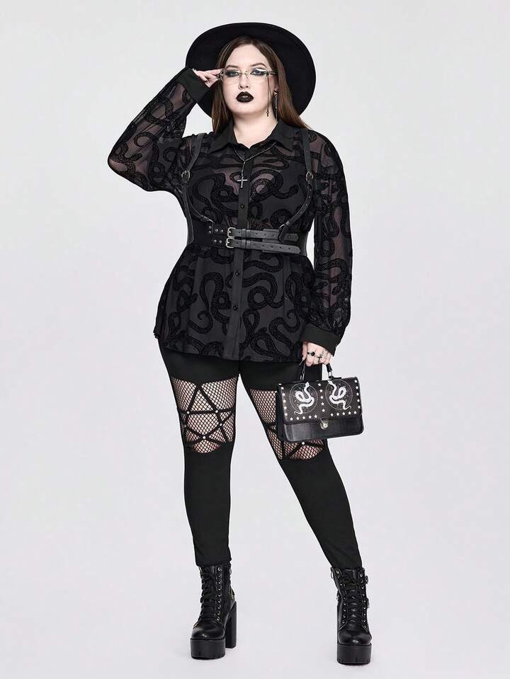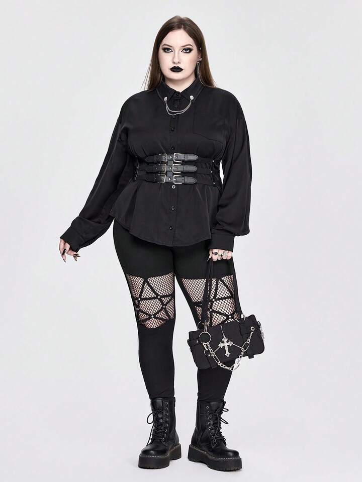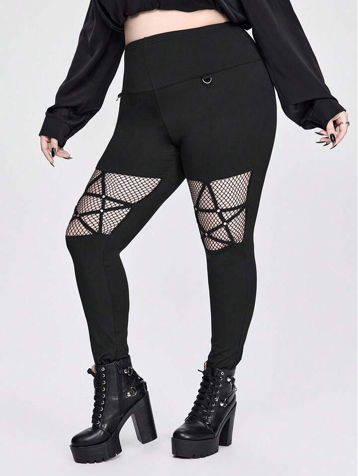 Goth Pantalón ajustado elástico de talla grande para mujer con parche de malla Stu Star de cinco puntas