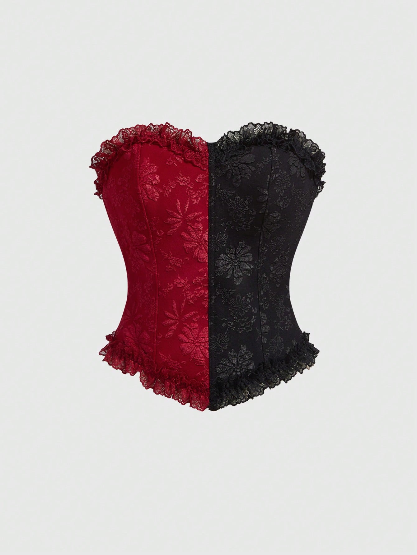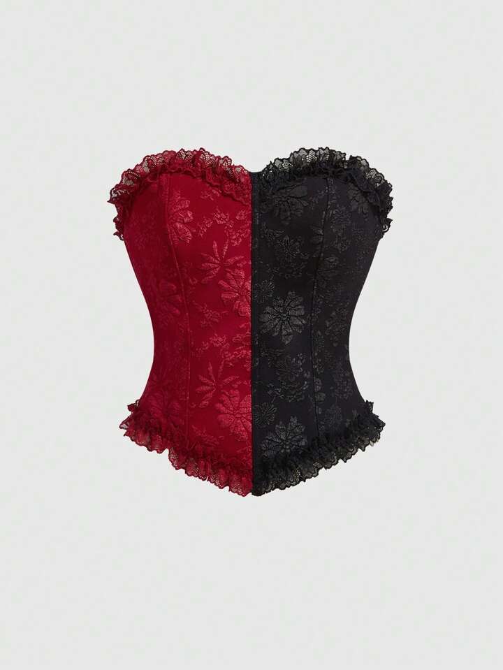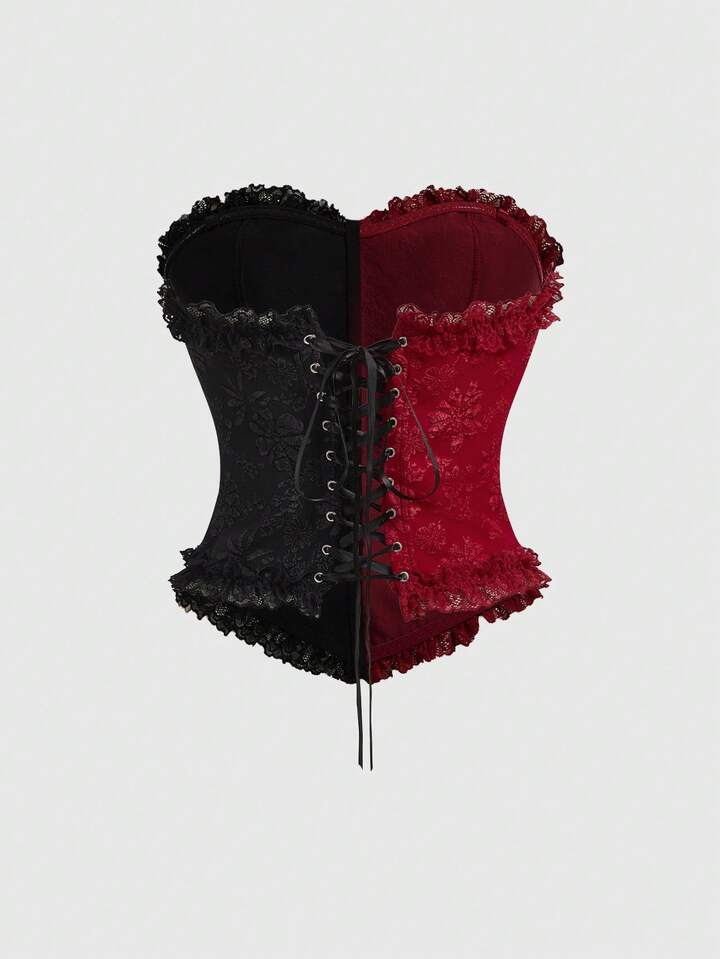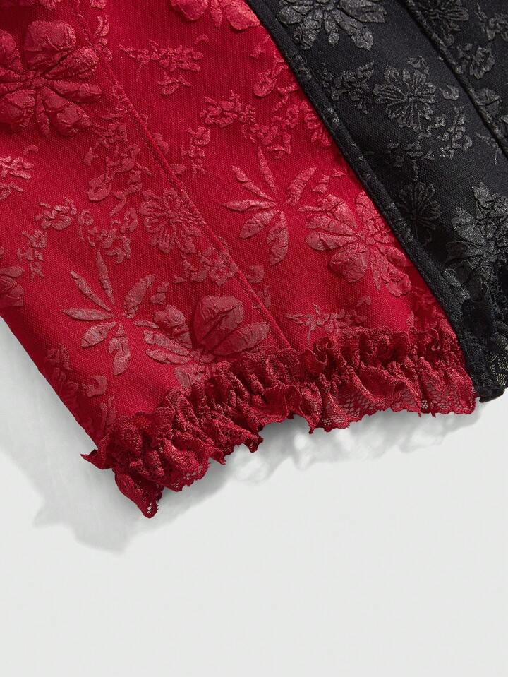 Goth Top corto con corsé de jacquard rojo y negro con mangas de campana de encaje estilo gótico