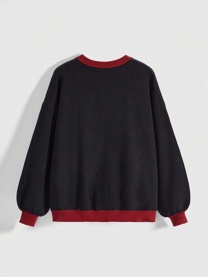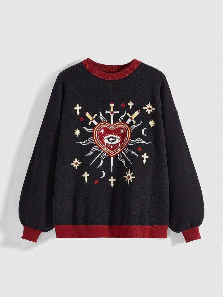 Goth Suéter de cuello redondo con bloques de color en estilo gótico, misterioso y de bruja con diseños de sol, luna, estrella, corazón y ojo