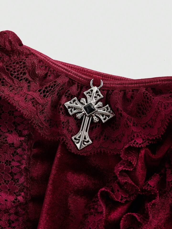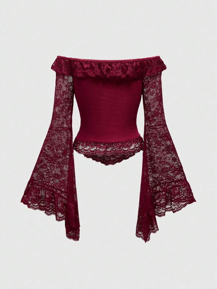Goth Blusa de terciopelo con hombros descubiertos, mangas acampanadas y encaje en estilo gótico retro para mujeres