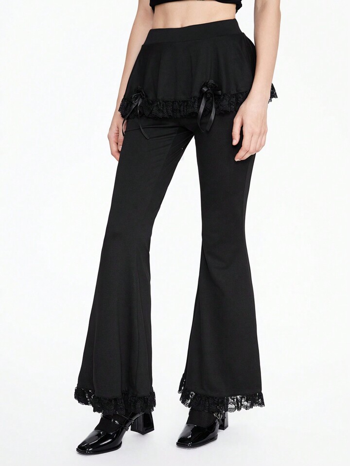 Goth Pantalones acampanados de Body ceñido con decoración de volantes florales estilo gótico romántico para mujeres