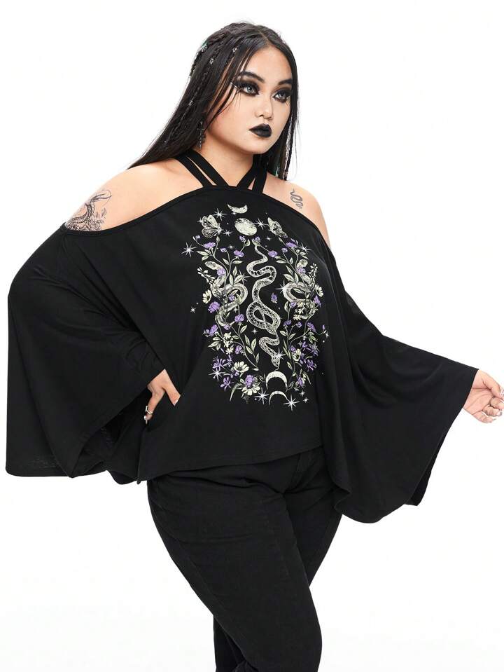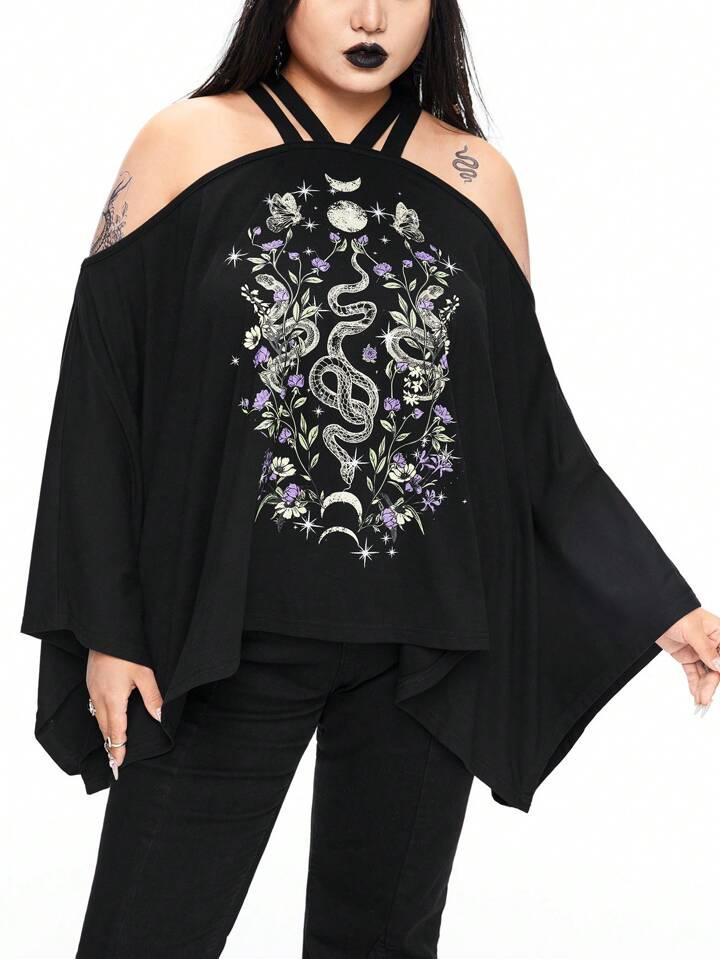 Goth Camiseta de murciélago de talla grande con diseño gótico y sexy de serpiente, estrella, luna y flor misteriosa impresa