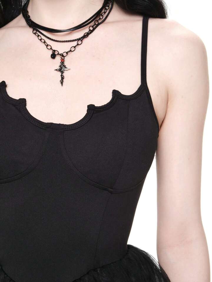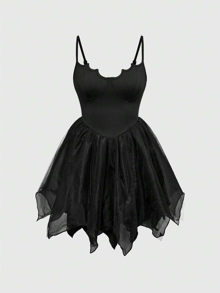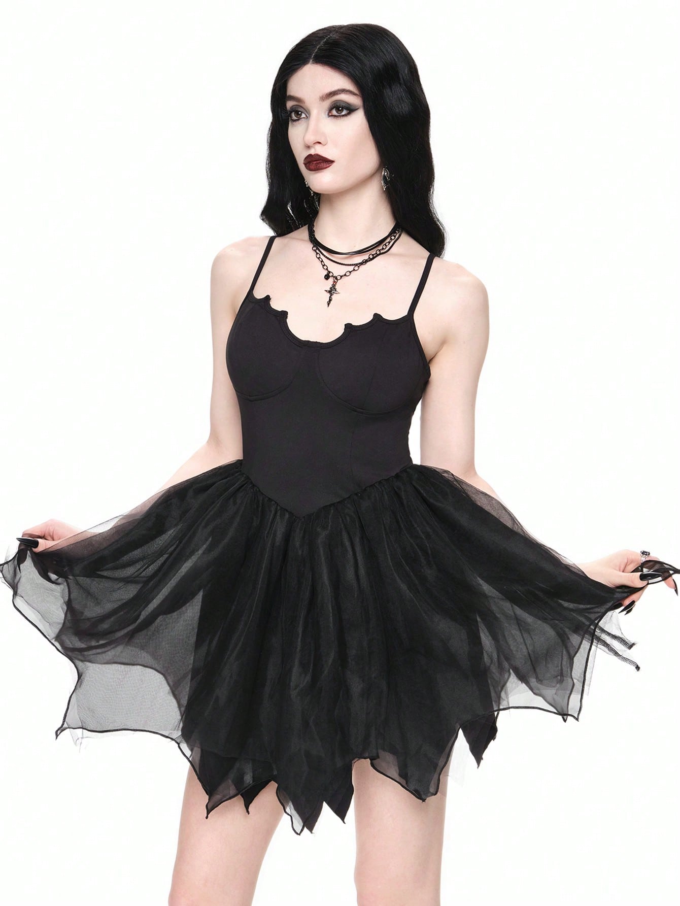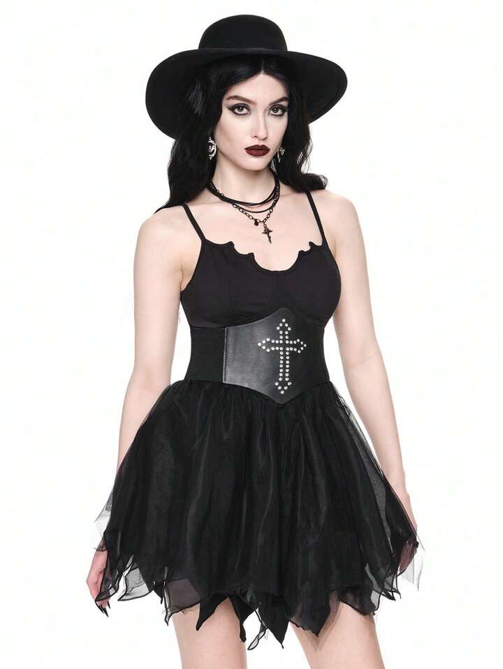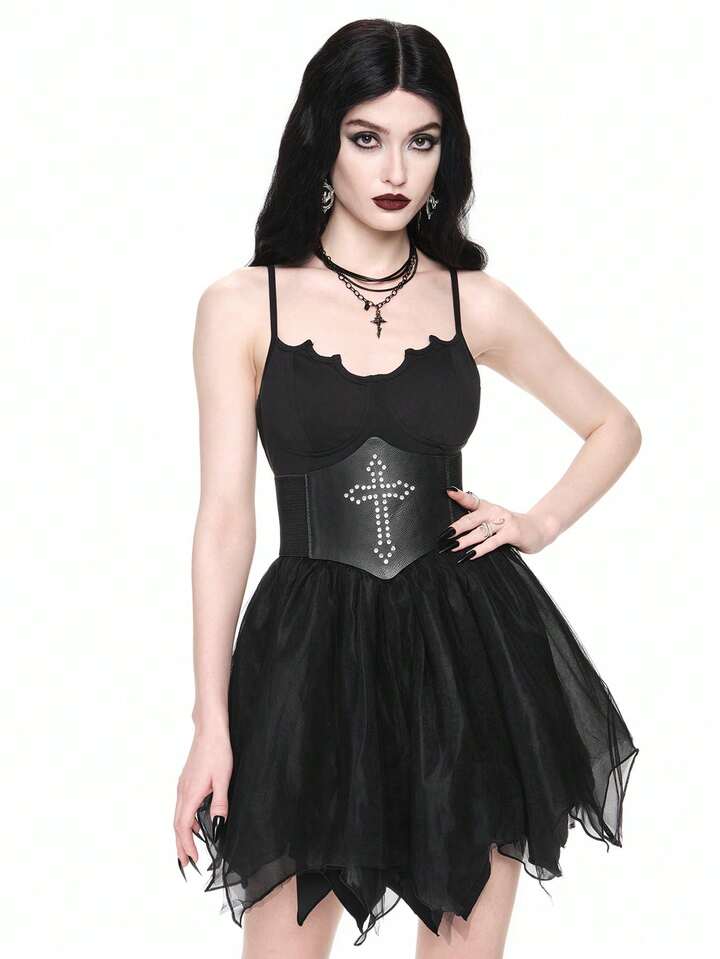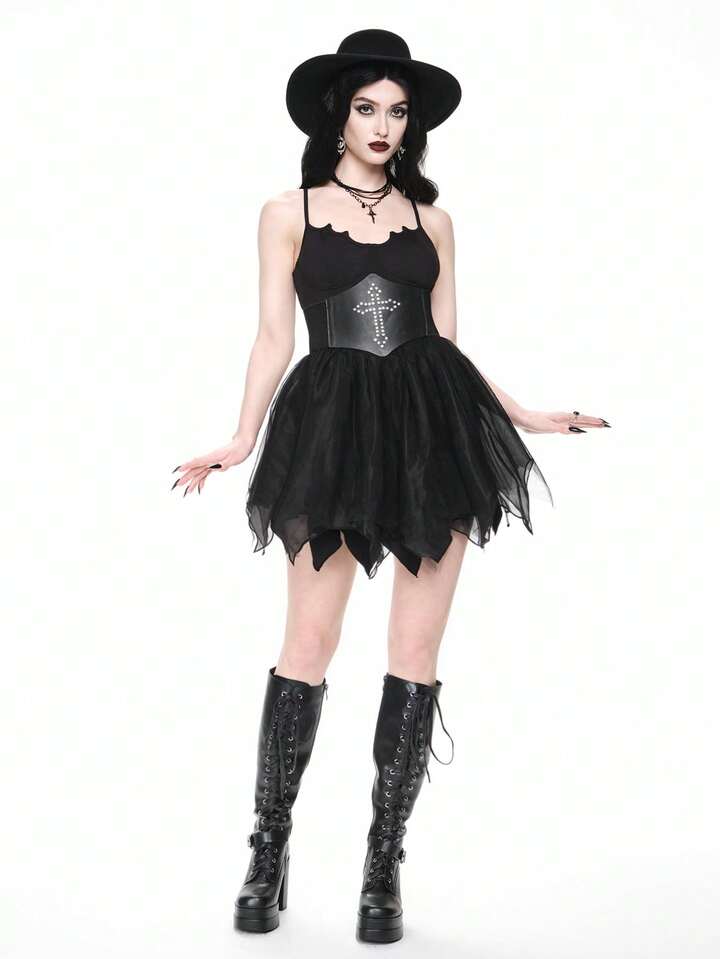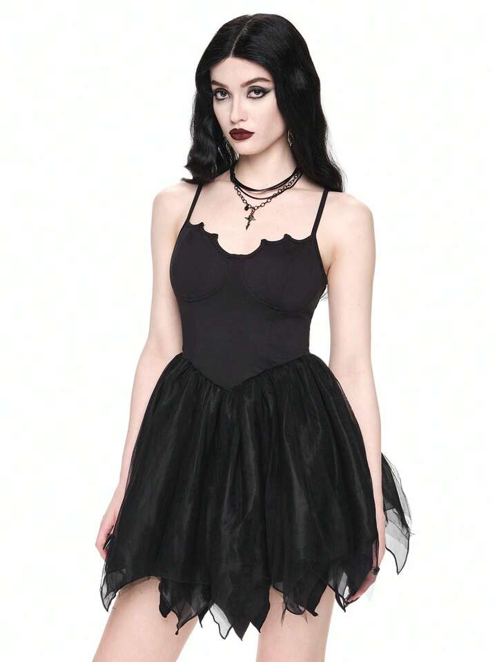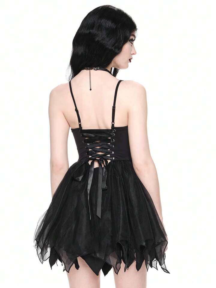 Goth Vestido de fiesta sexy gótico con tirantes cruzados en la espalda, Bottom de malla con forma de murciélago, para Halloween