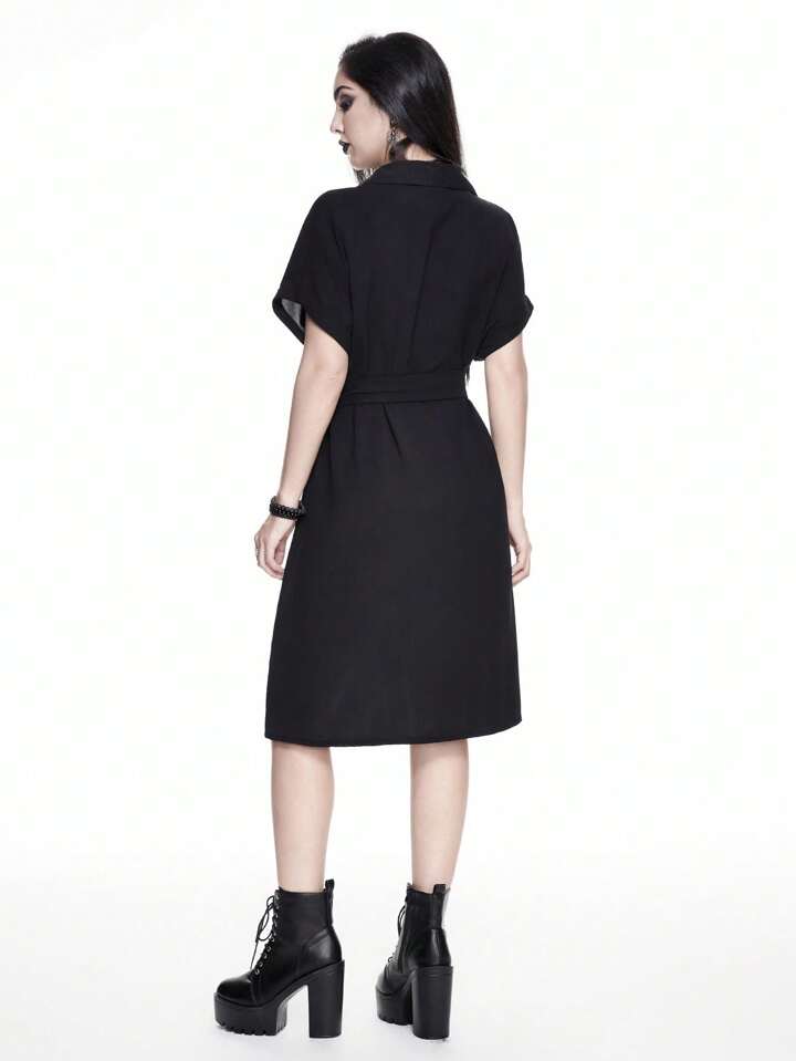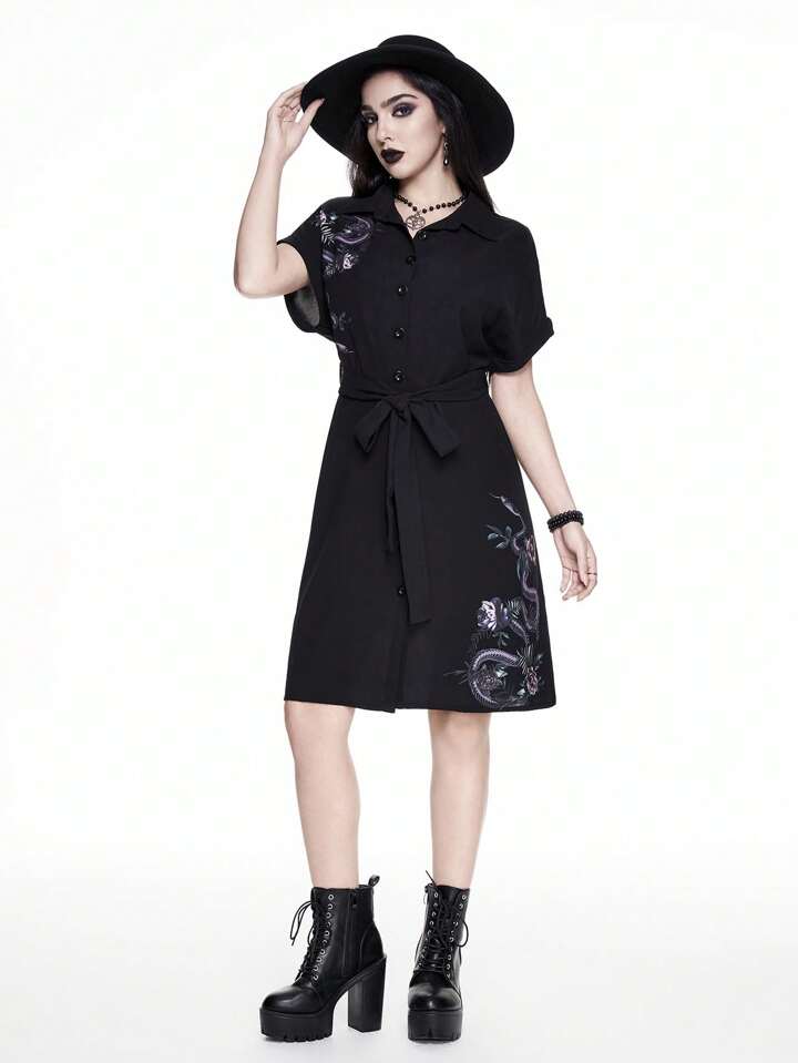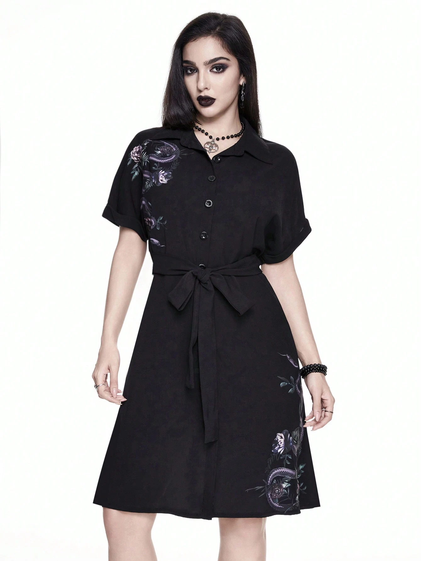 Goth Vestido camisa de mujer con cintura con nudo, estampado de piel de serpiente y floral en estilo gótico