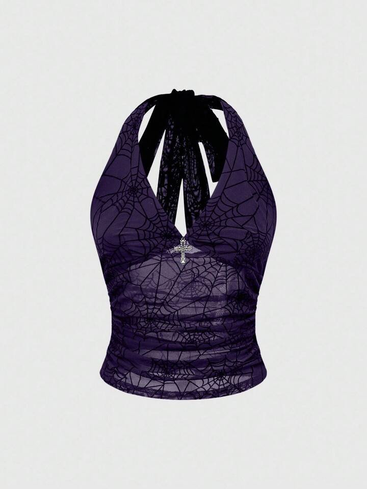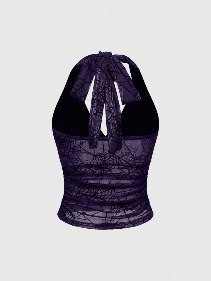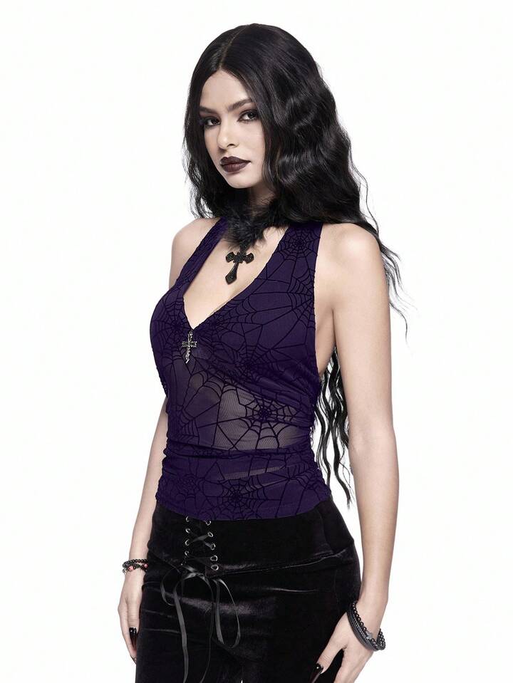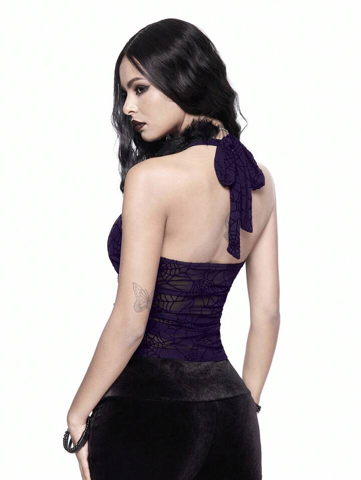 Goth Top halter de cuello sin mangas ajustado con estampado de telaraña gótico para mujeres