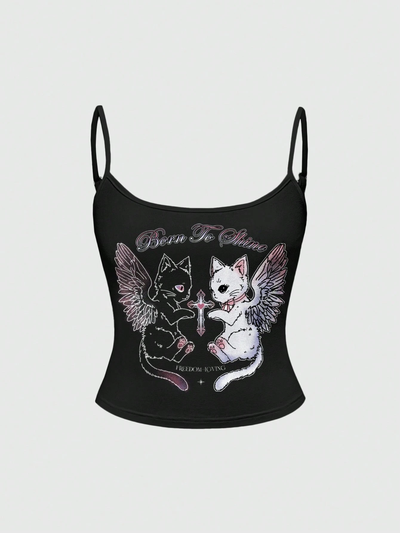 Goth Camiseta de tirantes de mujer con estampado de gato, cruz y corazón en estilo gótico