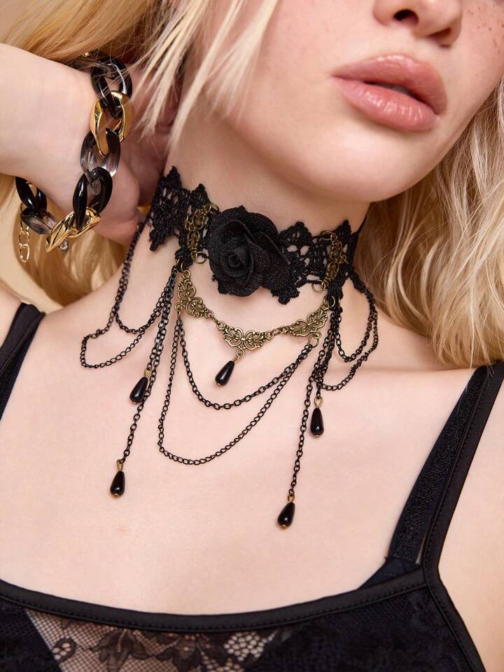 Goth Collar de estilo gótico, de lujo, con encaje negro, flor y flecos para mujeres, ideal para el Día de San Valentín