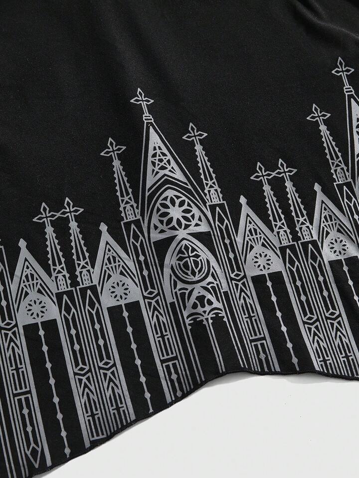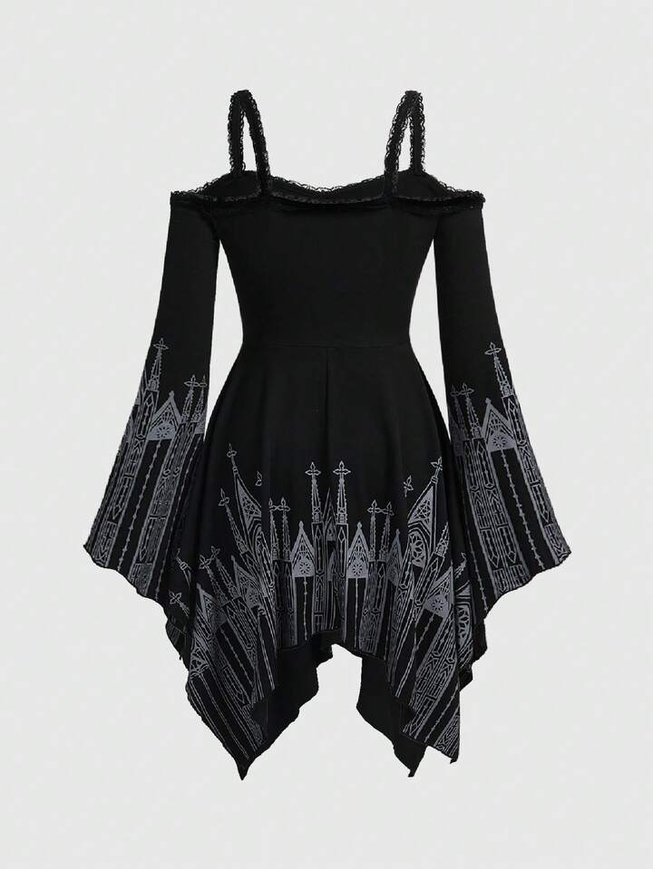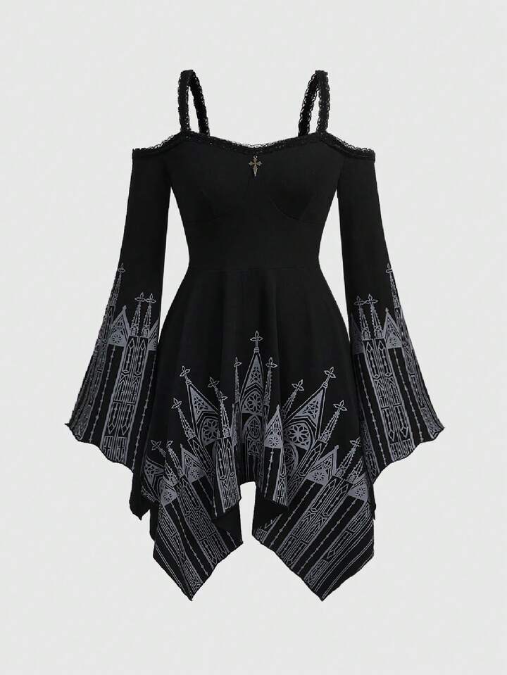 Goth Vestido camisero con hombros descubiertos, encaje de contraste, estampado de iglesia y bajo asimétrico, estilo gótico