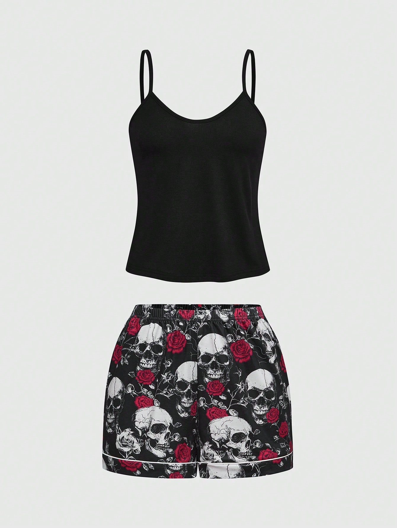 Goth Pijama de conjunto de camiseta de tirantes y shorts con estampado de rosa y calavera en estilo gótico