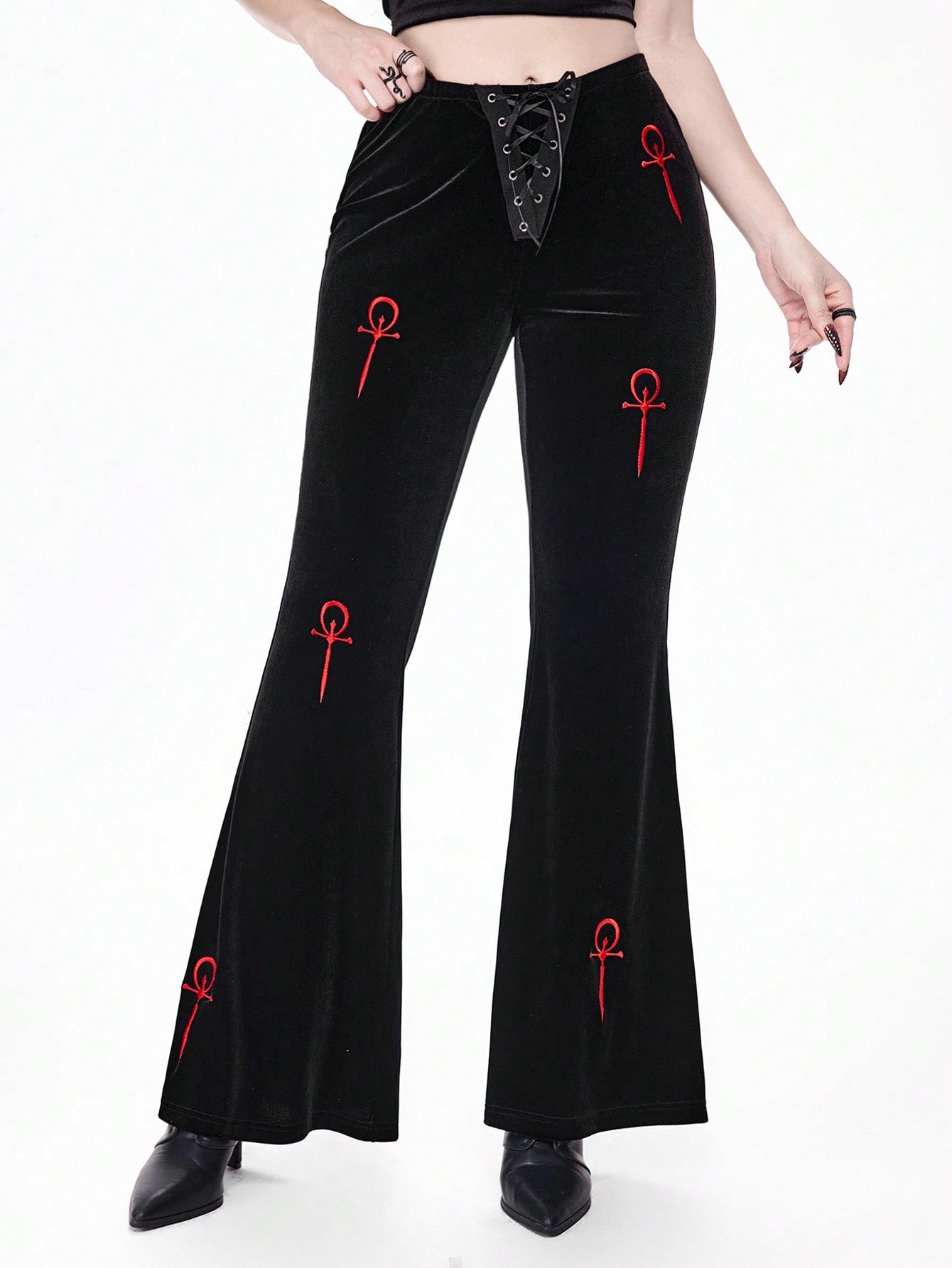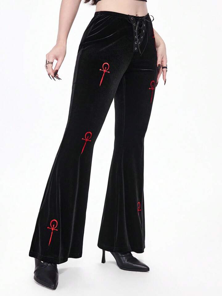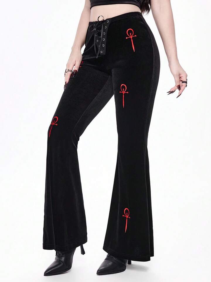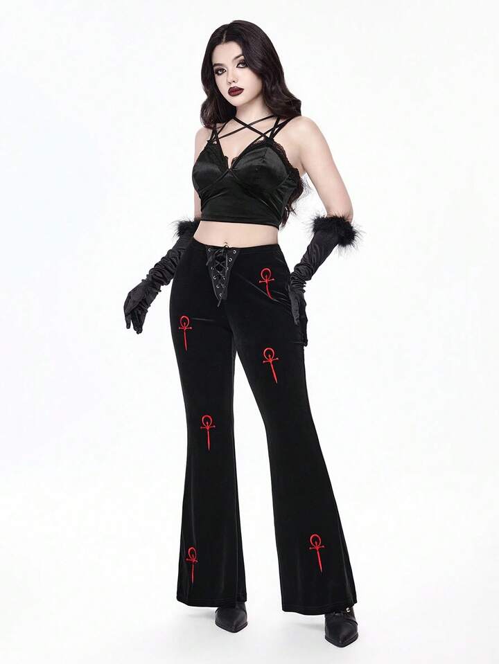 Goth Pantalones acampanados con bordado de Anj de terciopelo estilo gótico para mujeres
