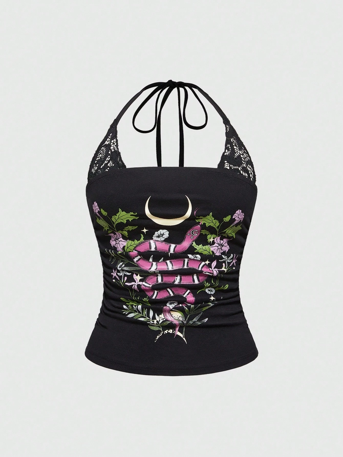Goth Camiseta de tirantes de mujer con estampado de bruja, serpiente oscura, luna y flor, estilo gótico, Halloween