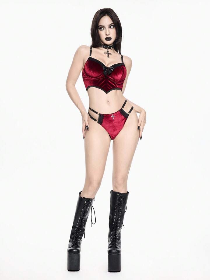 Goth Conjunto de lencería con sujetador con aros y tanga con diseño de alas de murciélago y cruz de terciopelo gótico