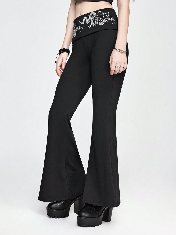 Goth Pantalones de campana con estampado de serpiente y elemento sol-luna gótico para mujer