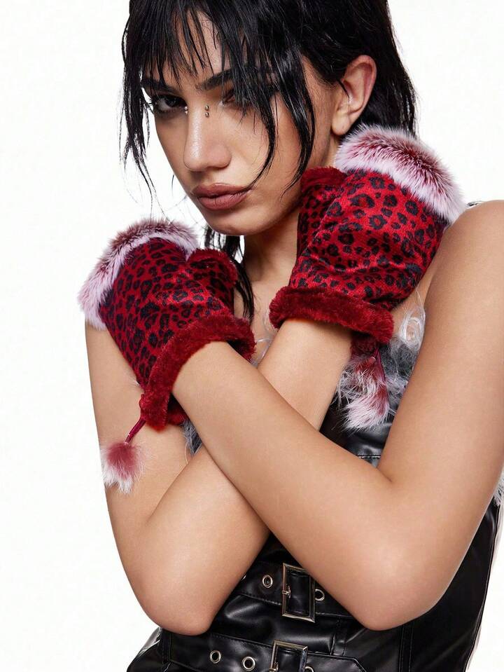 Grunge Punk 1 par de guantes de estilo punk con estampado de leopardo de piel sintética, guantes cálidos y esponjosos de estilo Y2K
