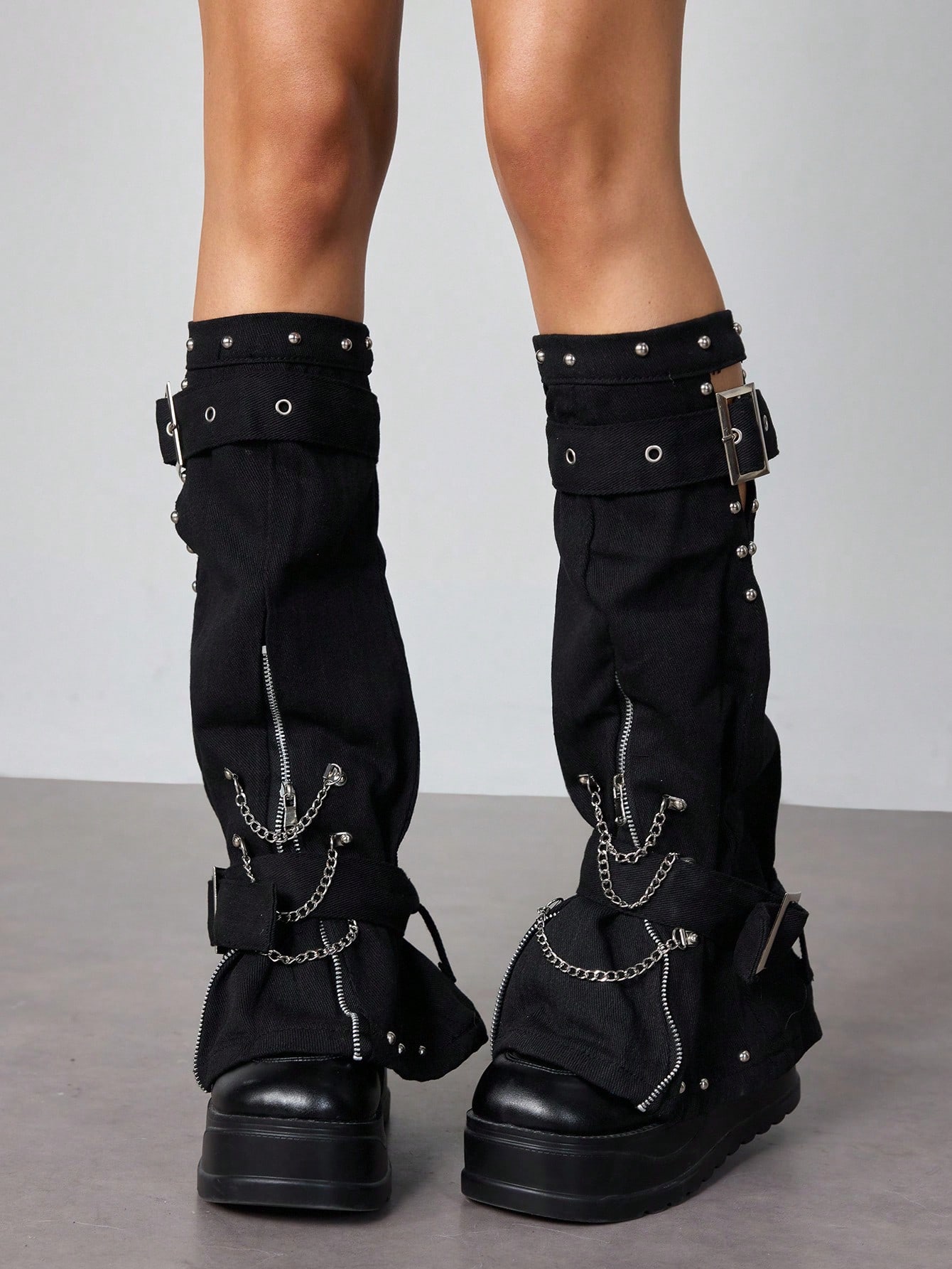 Grunge Punk 1 par de calentadores de piernas con elemento de cadena con cremallera de estilo punk, manga de pierna estilo goth lolita con correas, diseño adelgazante, adecuado para uso diario y fiestas, con decoración de hebilla de metal