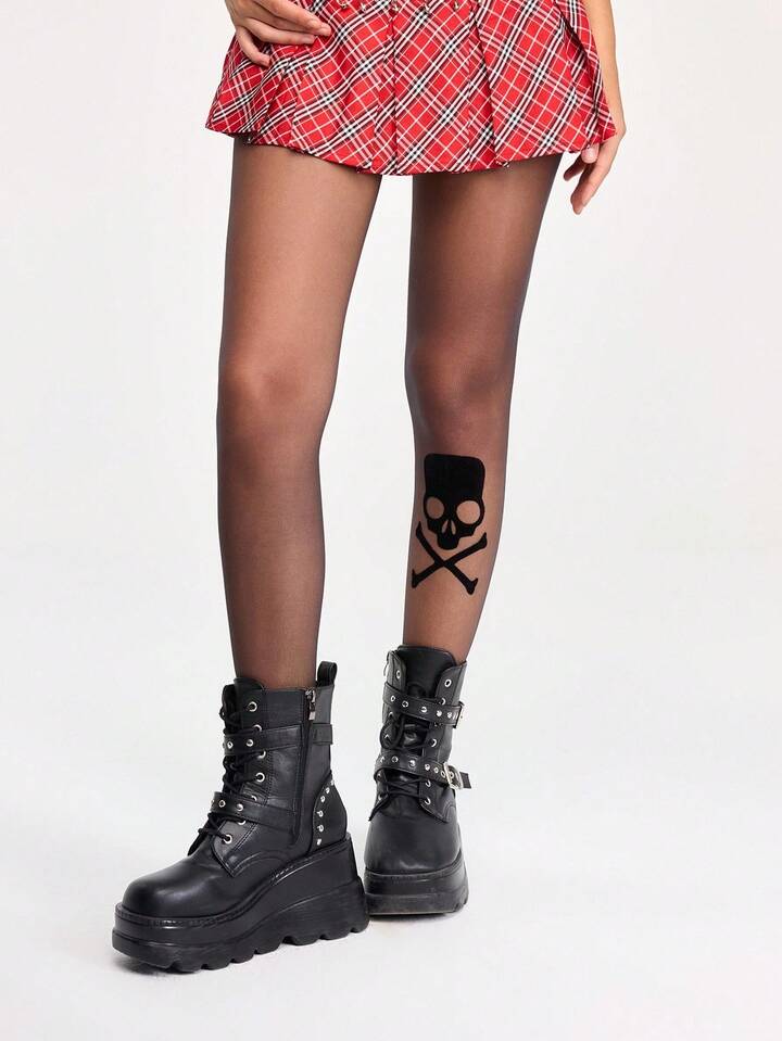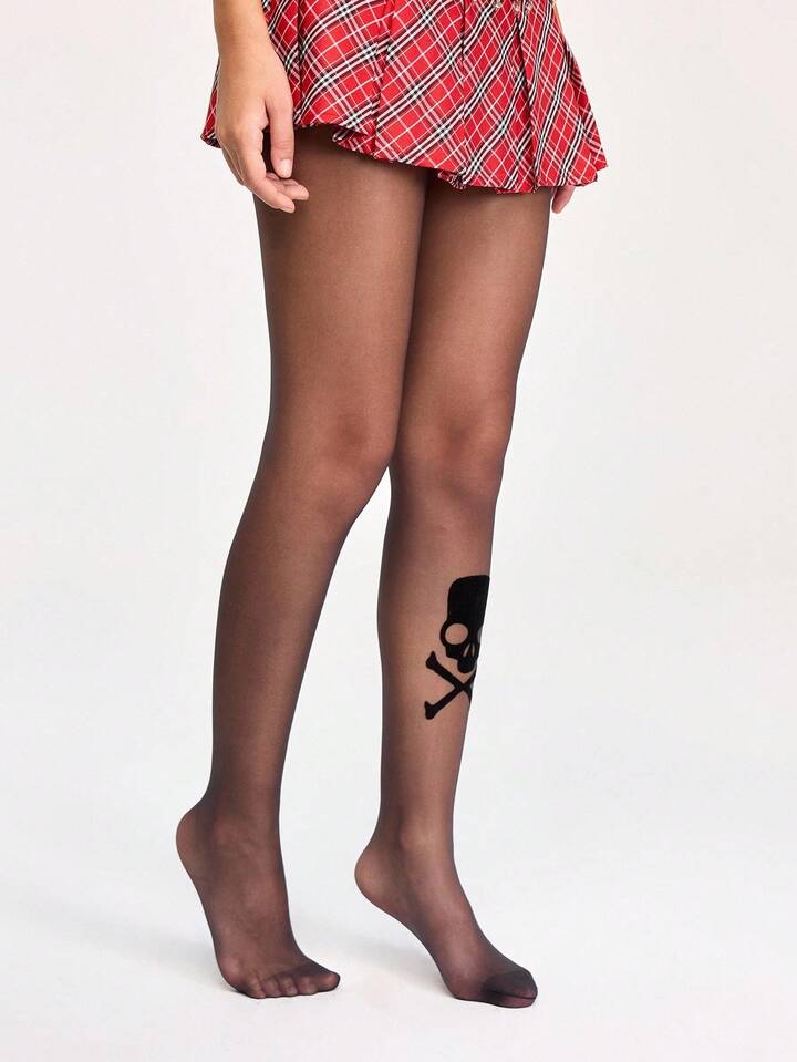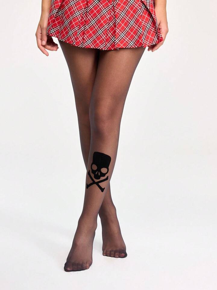 Grunge Punk 1 par de medias con estampado de esqueleto sexy, pantimedias de color negro sólido con estilo minimalista Y2K, leggings transparentes súper delgados y elásticos