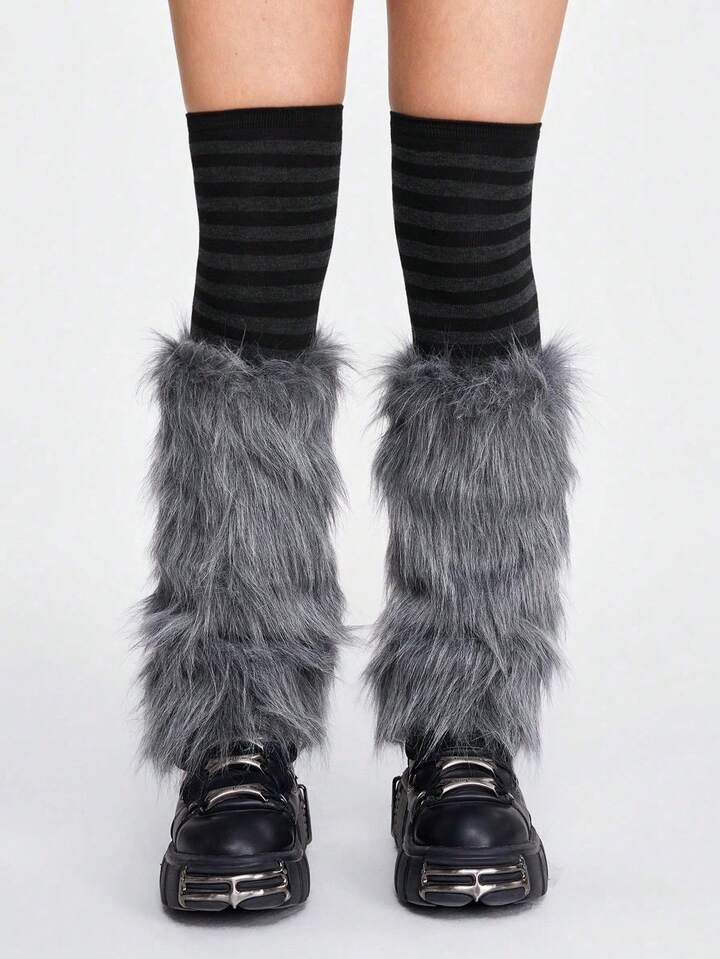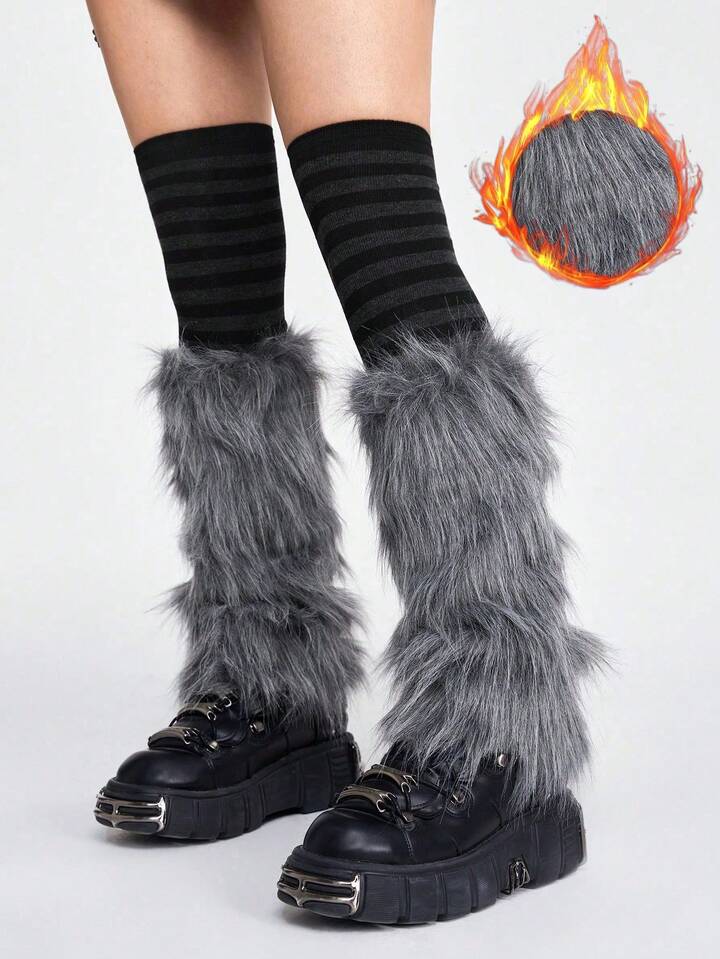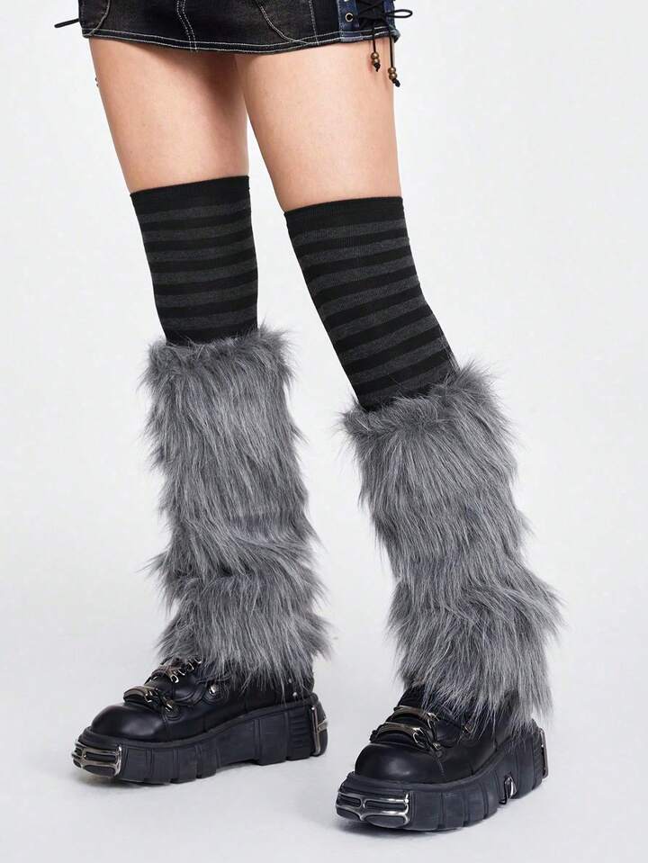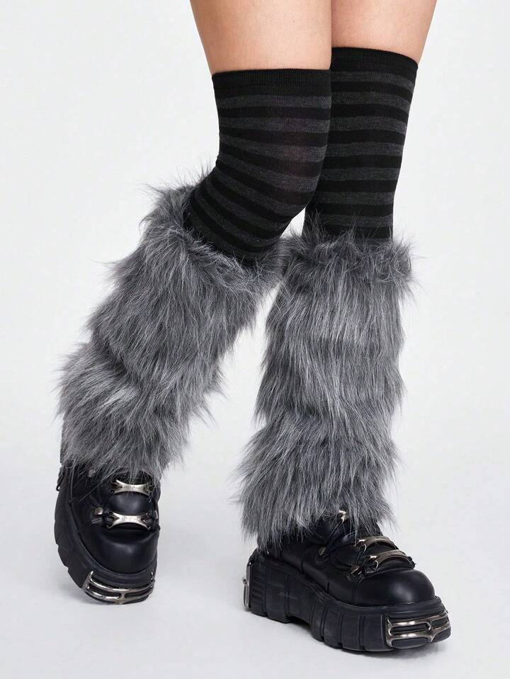 Grunge Punk 1 par de calcetines sobre la rodilla a rayas + 1 par de calentadores de piernas esponjosos, set de 2 piezas en colores sólidos minimalistas, estilo femenino Y2K, adecuado para capas diarias y mantener el calor