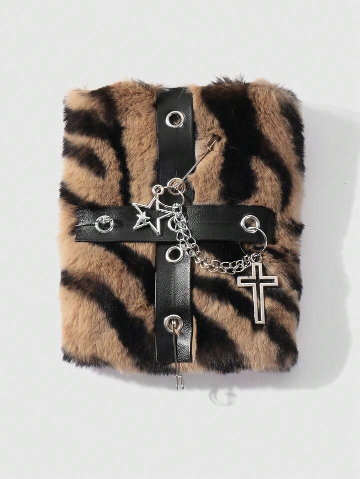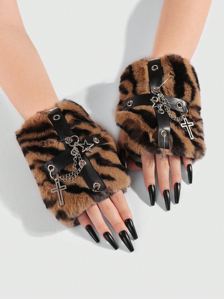 Grunge Punk 1 par de guantes sin dedos con cadena de estrella hueca y estampado de leopardo con textura suave de color marrón en estilo retro y elegante Y2K, adecuados para pantalla táctil, escritura y oficina, en empaque de caja de regalo para uso diario de mujeres/damas en invierno