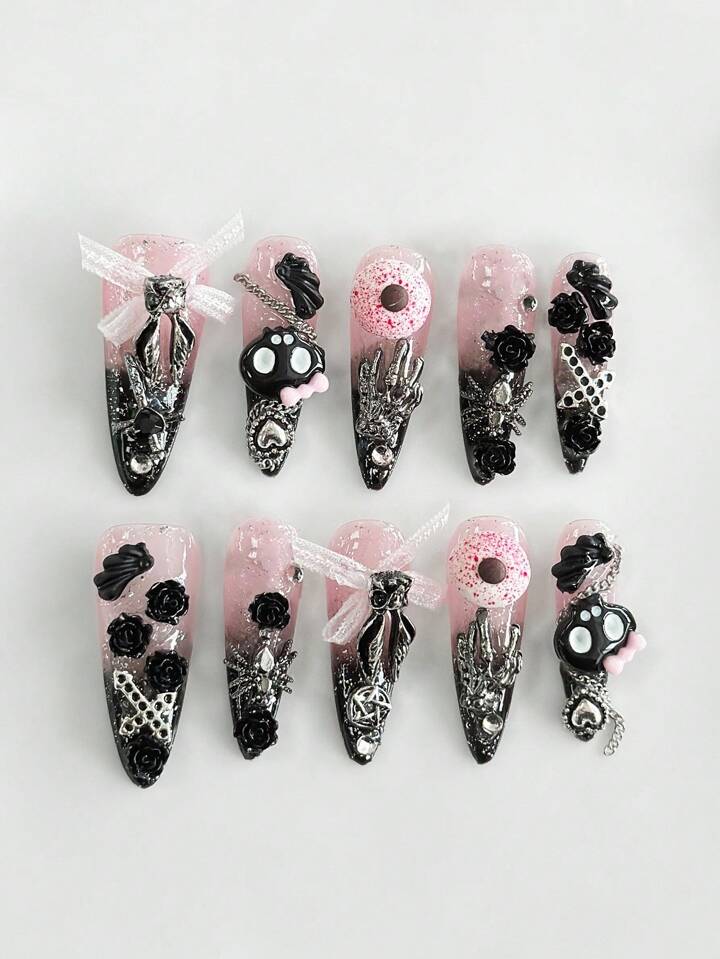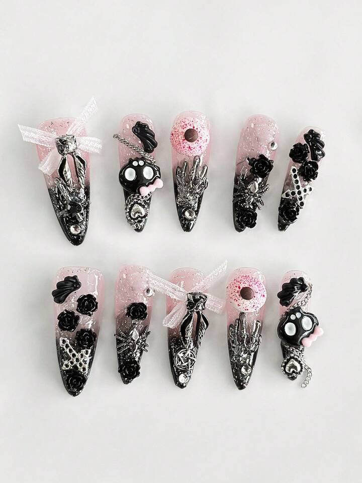 Grunge Punk 10 piezas de uñas postizas de alta calidad con diseños pintados a mano de rosa negra, calavera, araña, conejo, lazo, ojo y cruz en estilo Y2K Baddie + 3 piezas de pegatinas de arte de uñas con degradado negro y rosa, adhesivo doble cara, removible y reutilizable, adecuado para vacaciones, fiestas, baile y uso diario, Halloween