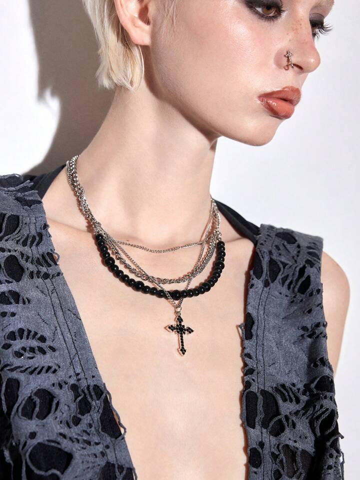 Grunge Punk 1 pieza Collar de cadena de metal con múltiples capas, cuentas redondas y elemento de cruz en estilo punk, collar gargantilla vintage de alta calidad con incrustaciones de strass, accesorio versátil de diseño único