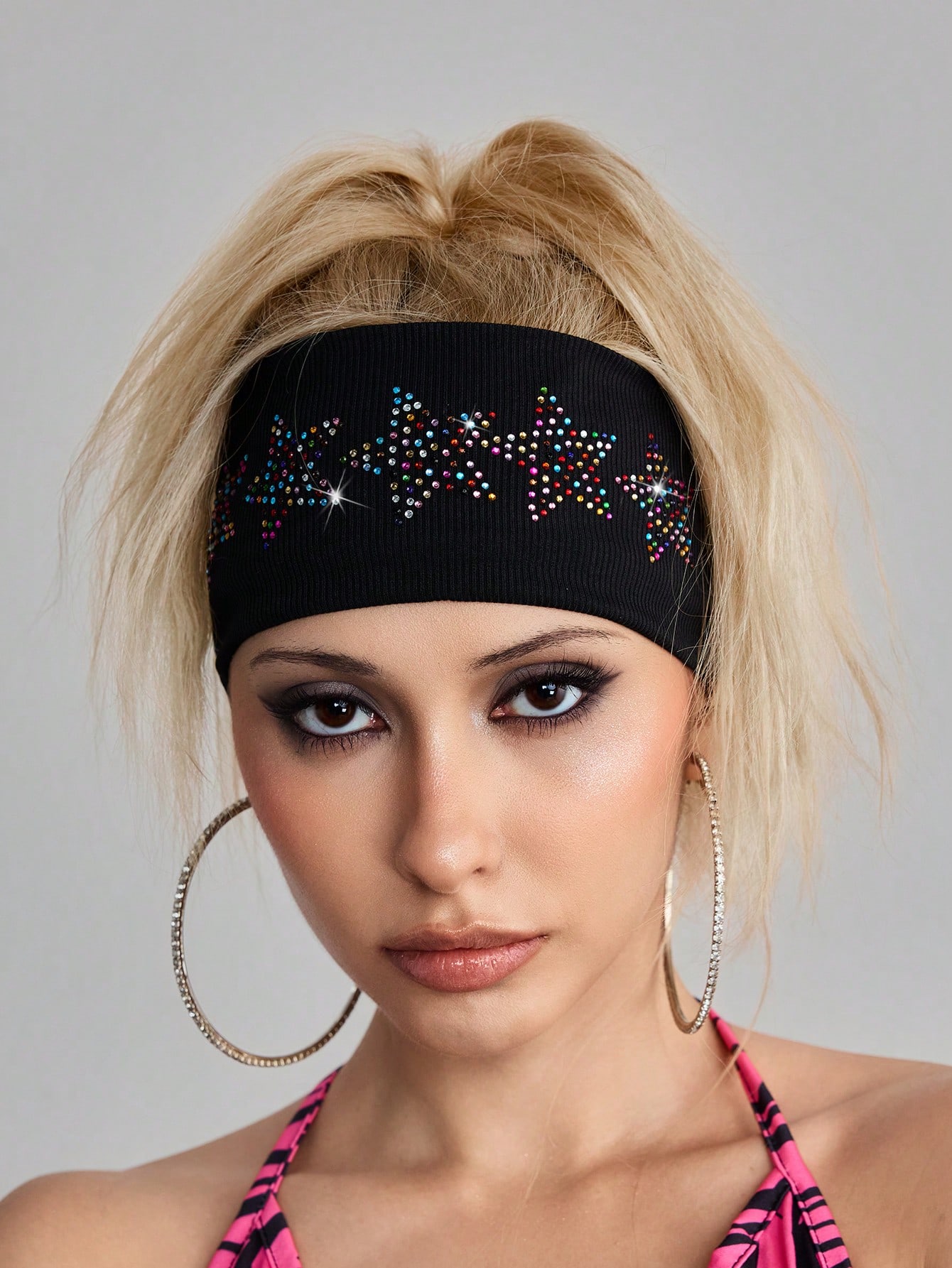 Grunge Punk 1 pieza Diadema de punto con patrón de estrellas de rhinestone en estilo punk, diadema ancha de color negro sólido con tachuelas minimalista, diadema deportiva/yoga absorbente del sudor, accesorio versátil para uso diario