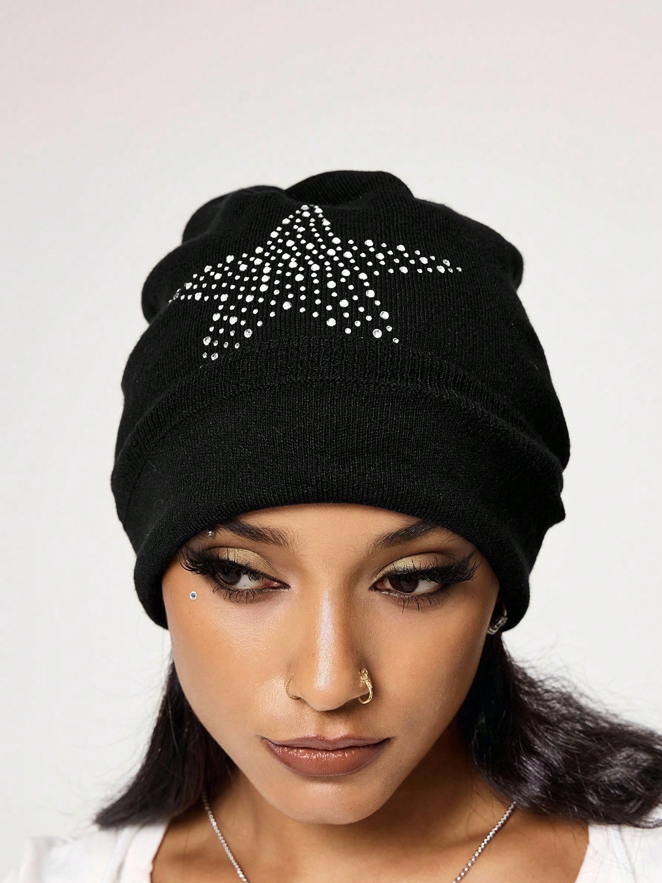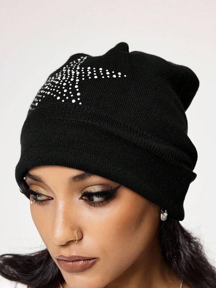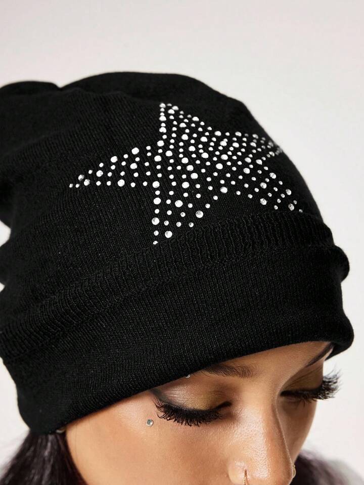 Grunge Punk 1 pieza Gorro tipo punk con estrellas remachadas, Gorro vintage de alta calidad color negro sólido, Sombrero con puños a la moda para uso diario en todas las estaciones