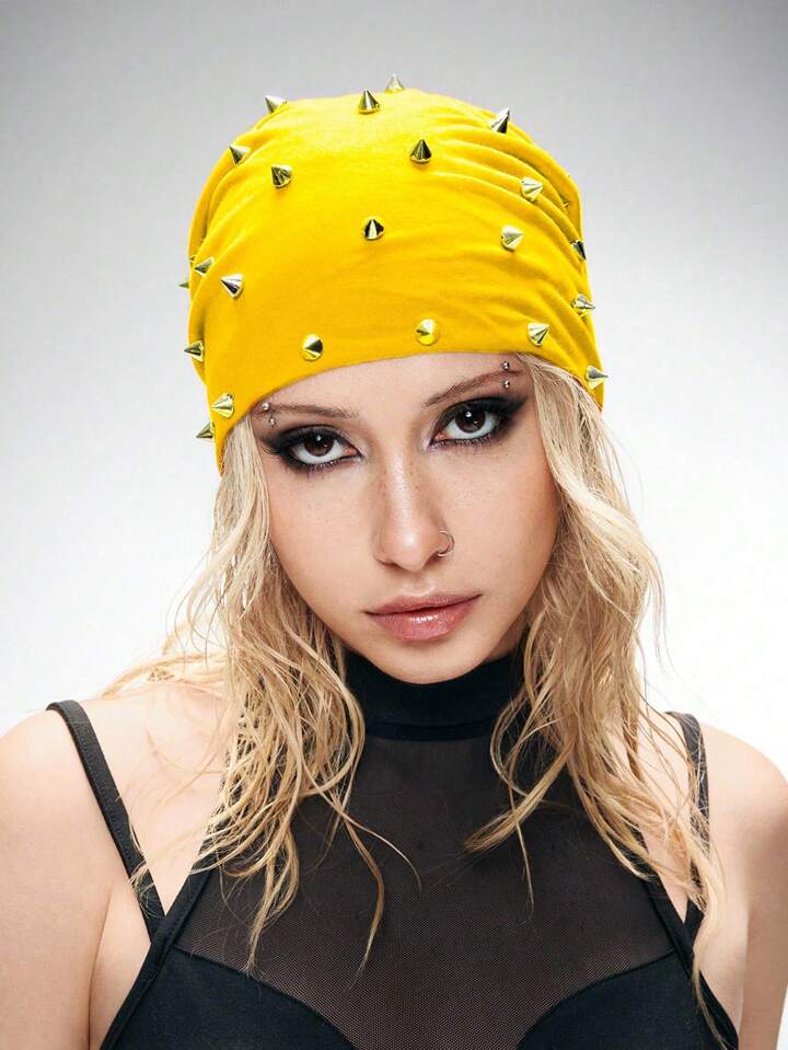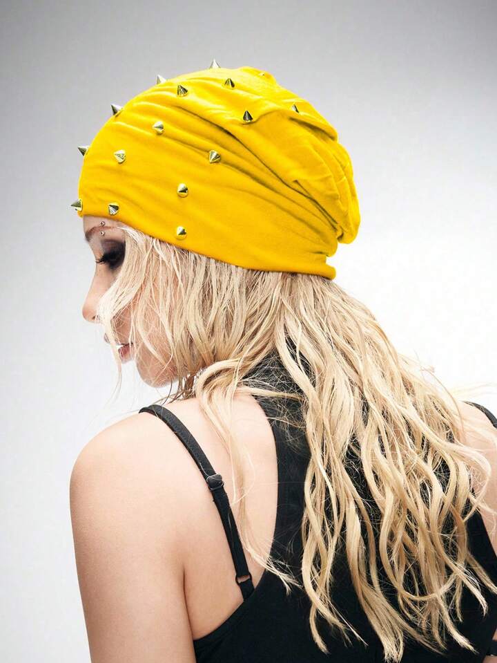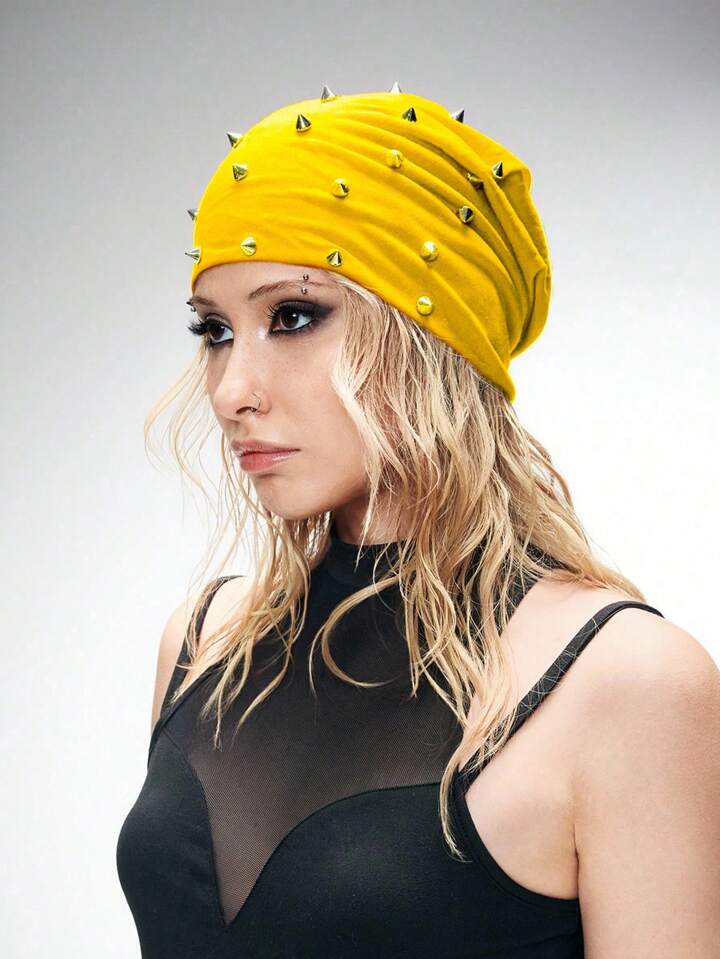 Grunge Punk 1 pieza Gorro estilo punk con remaches delgado, Gorra amarilla sólida vintage de alta calidad al estilo Y2K, holgado, para uso diario y en todas las estaciones