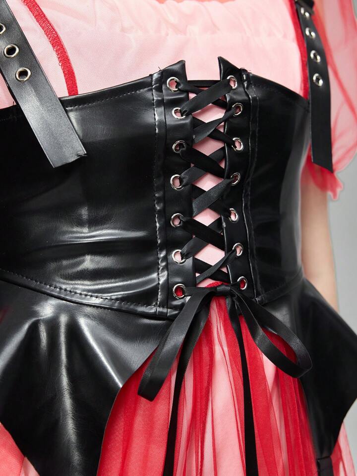 Grunge Punk 1 pieza Falda mono de mujer en negro de PU con cordones y decoración de flecos, estilo punk oscuro, versátil para uso diario