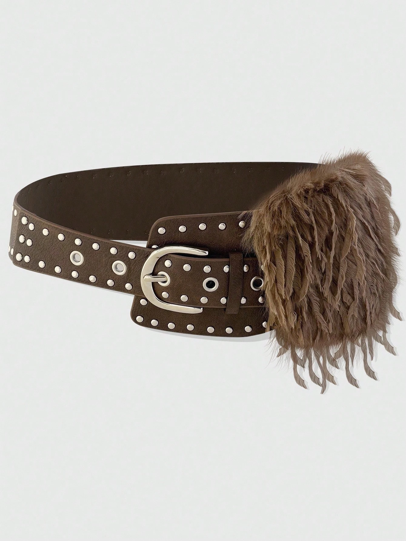 Grunge Punk 1 pieza Cinturón de mujer estilo occidental/bohemio con remaches marrones y plateados, decoración de plumas, accesorio versátil para vestidos, vaqueros y uso diario