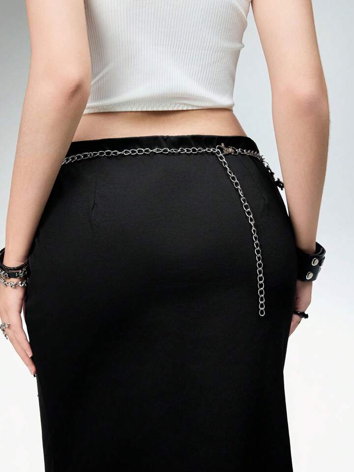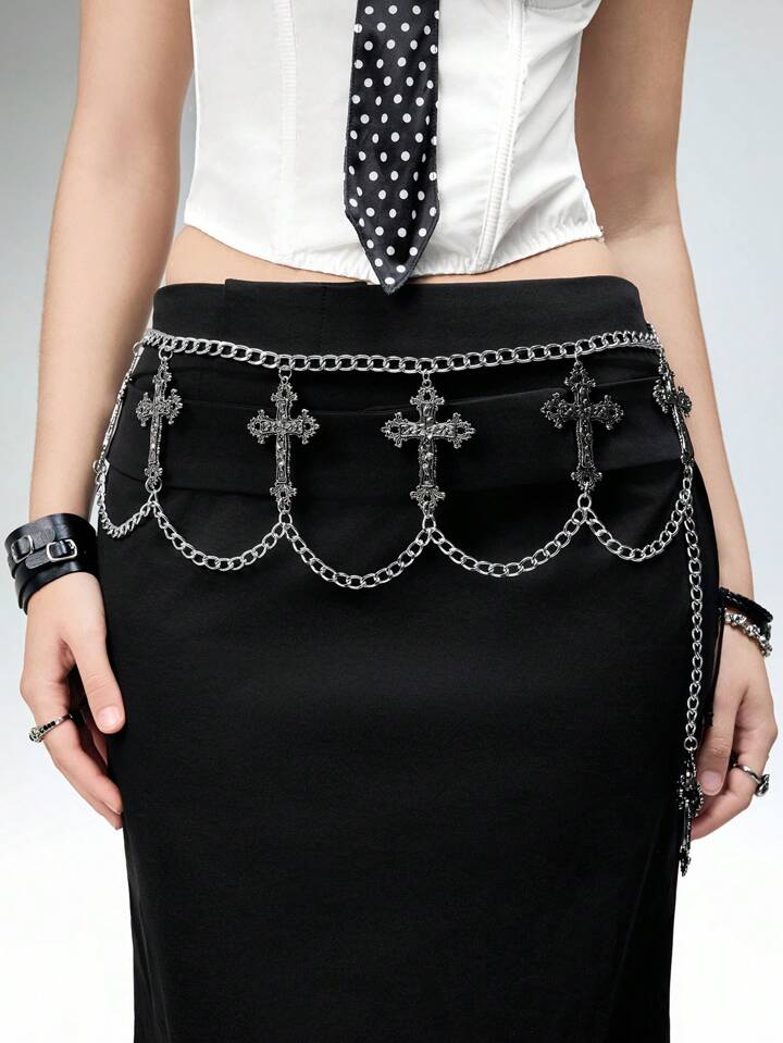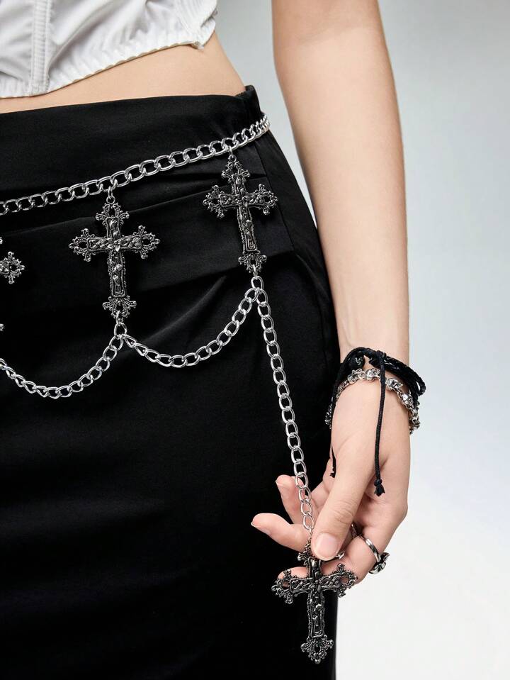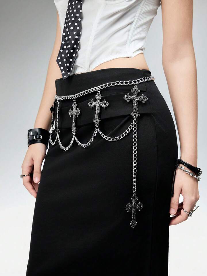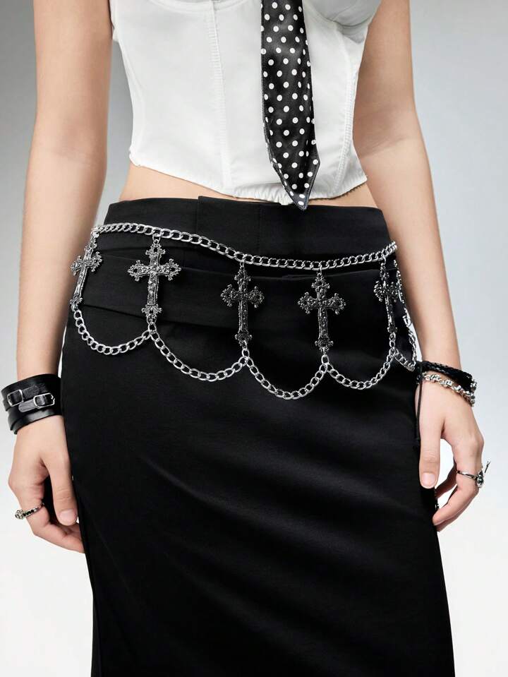 Grunge Punk 1 pieza Cadena decorativa de vestido con doble capa de cruz plateada, accesorio gótico para el cinturón, versátil para uso diario