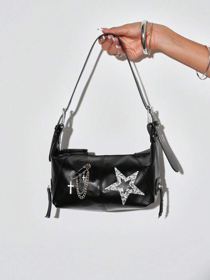 Grunge Punk 1 pieza Bolso bandolera style Biker Chic Y2K con diseño de estrella y cruz, negro, bolso de hombro versátil (los accesorios deben ensamblarse por uno mismo)