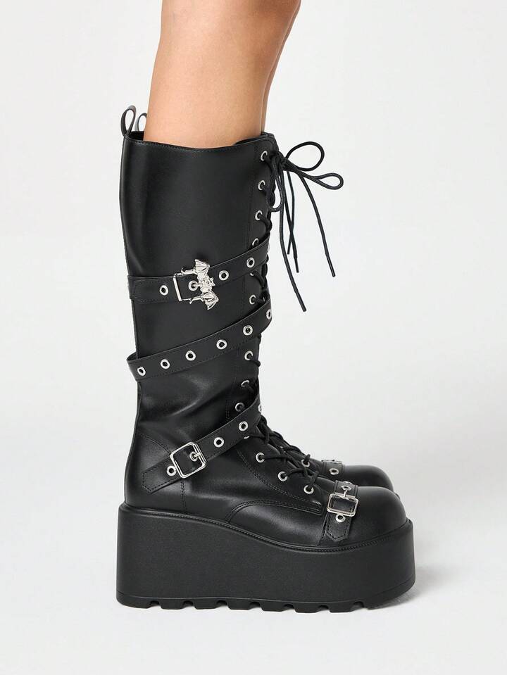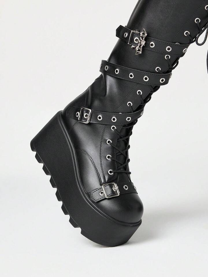 Grunge Punk Botas de caña alta con suela gruesa y hebilla de estilo punk, de nueva temporada otoño/invierno 2025, con puntera redonda, de cuero, para uso exterior y de moda, de fácil puesta
