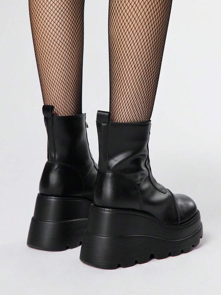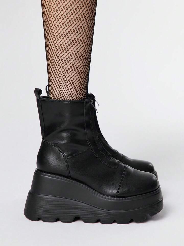 Grunge Punk Botas de plataforma con cuña de fondo grueso, de PU oscuro, impermeables, de caña corta, de cuero casual con cremallera frontal y elástico, para mujer