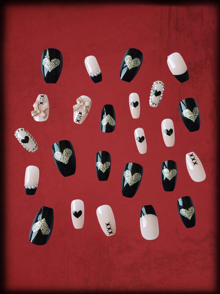 Grunge Punk 24 piezas largo ataúd con patrón de corazón Uña postiza & 1 hoja cinta