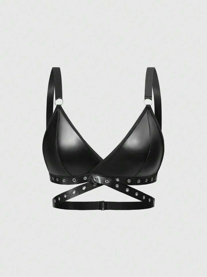 Grunge Punk Conjunto de Lencería Sexy de 3 Piezas, incluyendo Sujetador Vogue Triángulo de PU Gótico Punk Sin Mangas, Tanga y Liguero