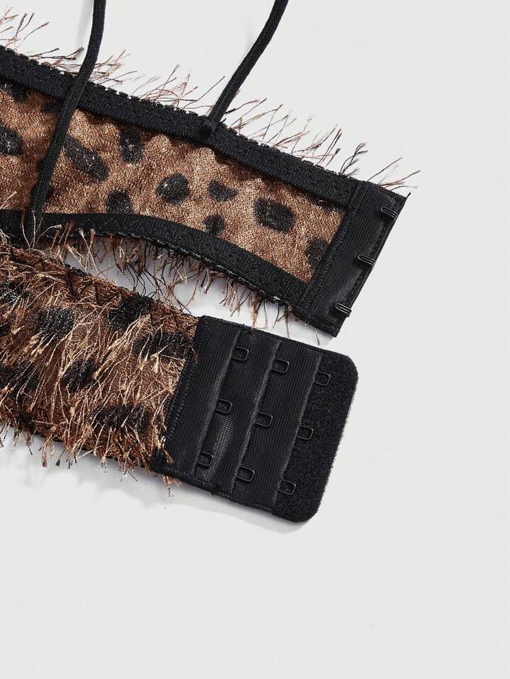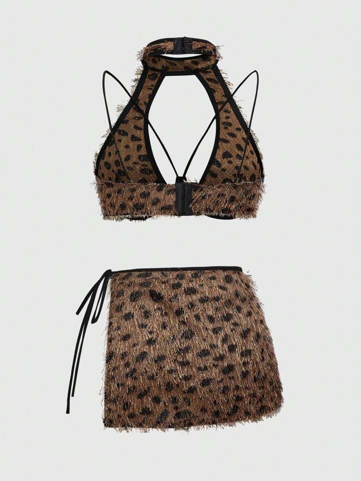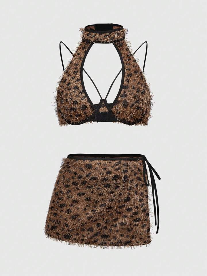 Grunge Punk Conjunto de lencería punk sexy de 3 piezas: Sujetador corto de leopardo con flecos, tanga y minifalda