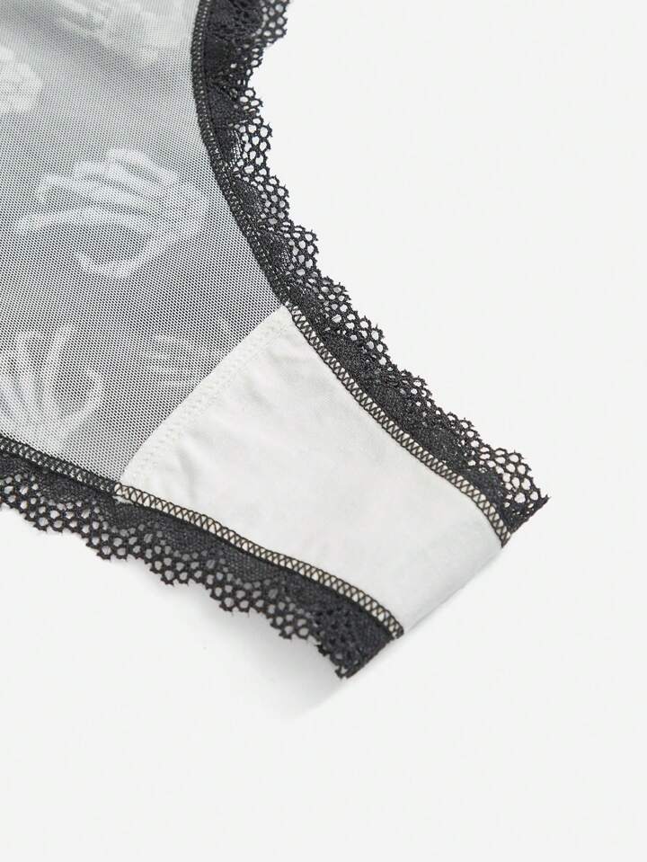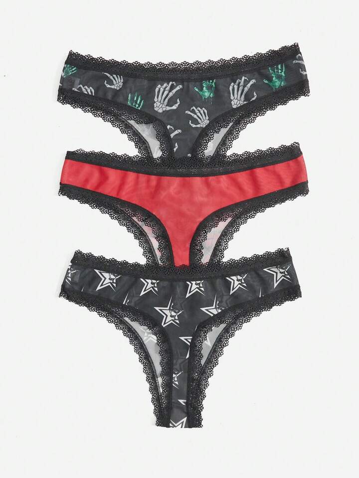 Grunge Punk 3 piezas Tanga con estampado de mano de calavera oscura y estrella con ribetes de encaje