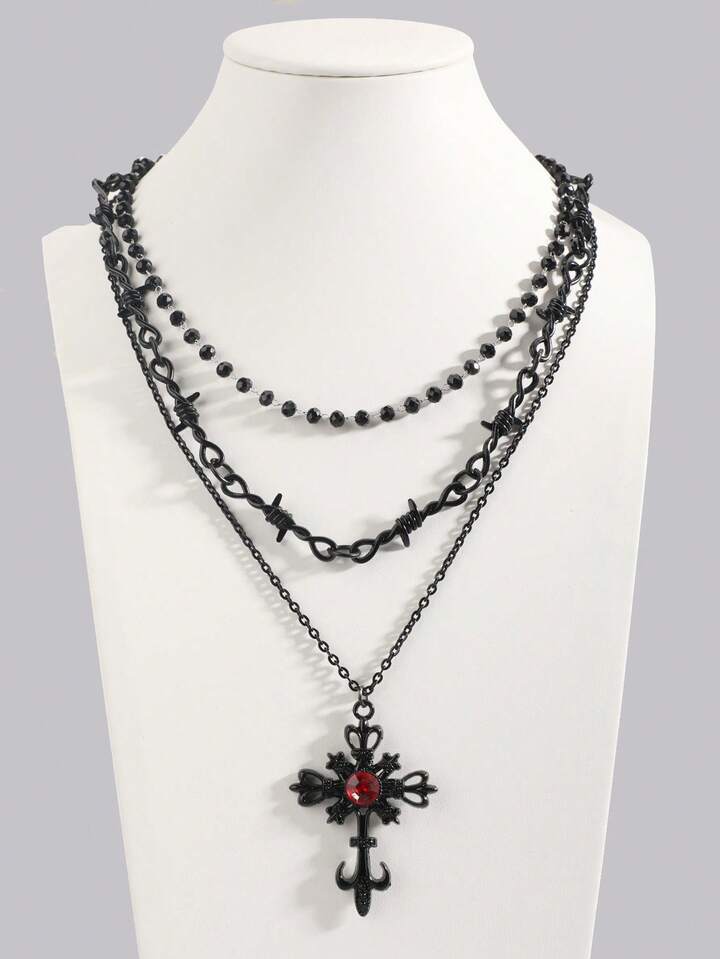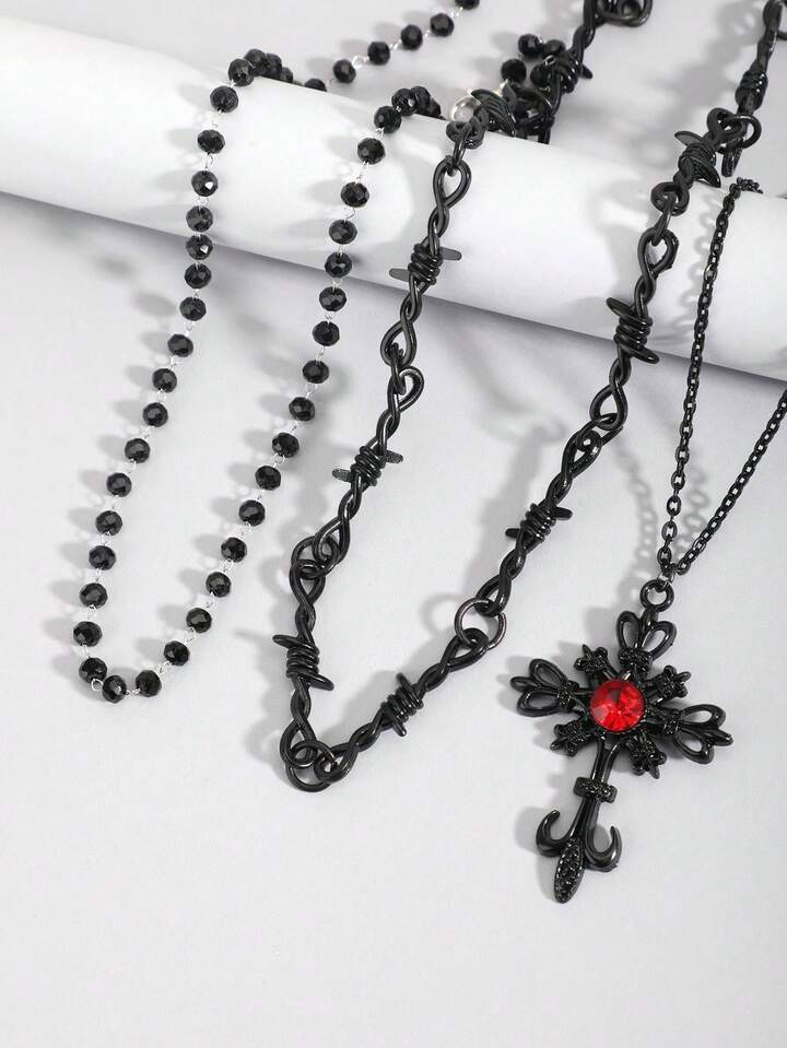 Grunge Punk Set de 3 collares con colgante de estilo gótico con cuentas negras, rosa de espinas rojas, cruz y corazón para mujeres