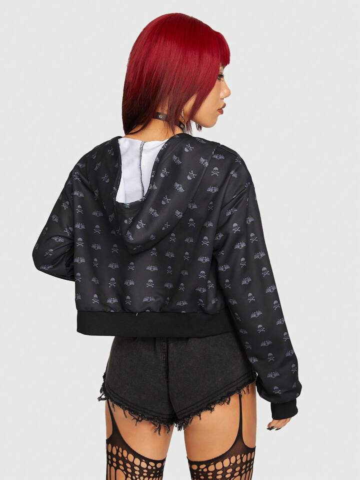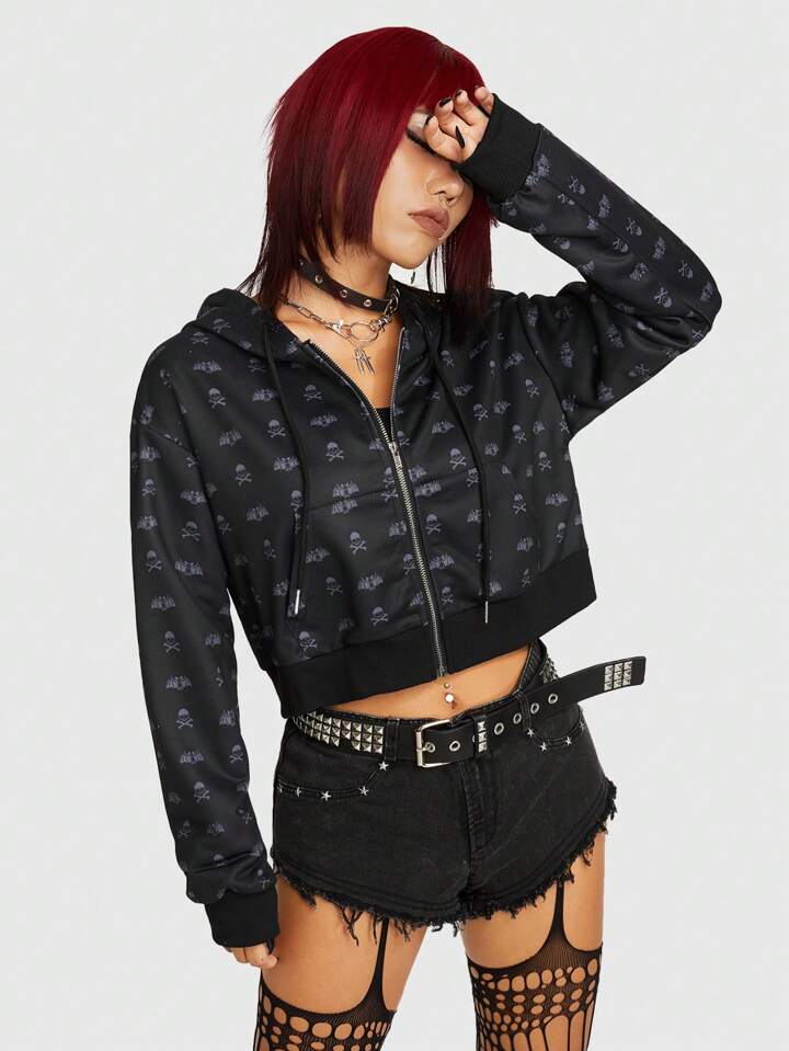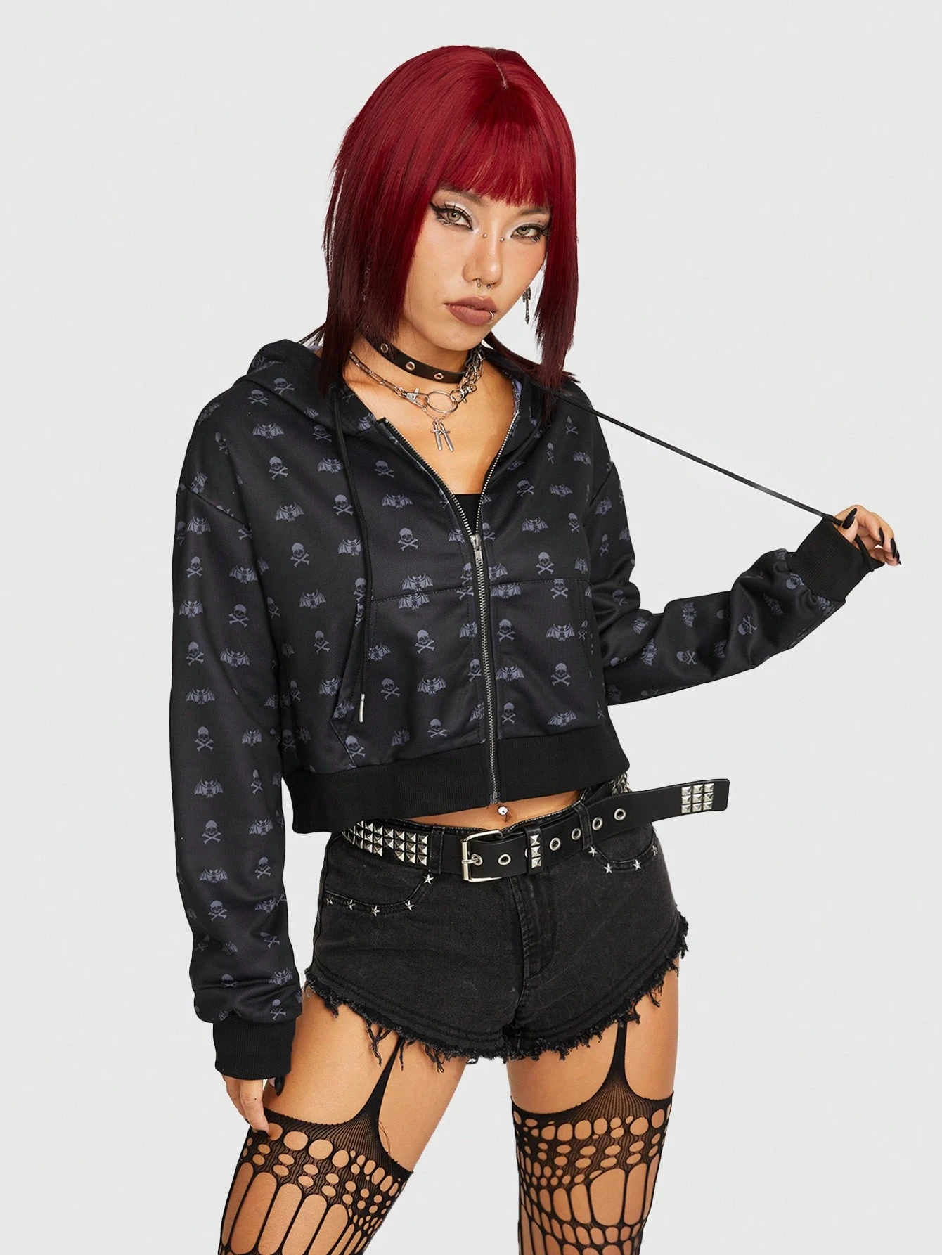 Grunge Punk Capucha estampado de cráneo con cremallera con cordón