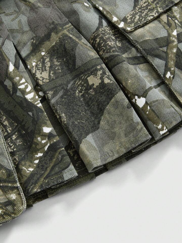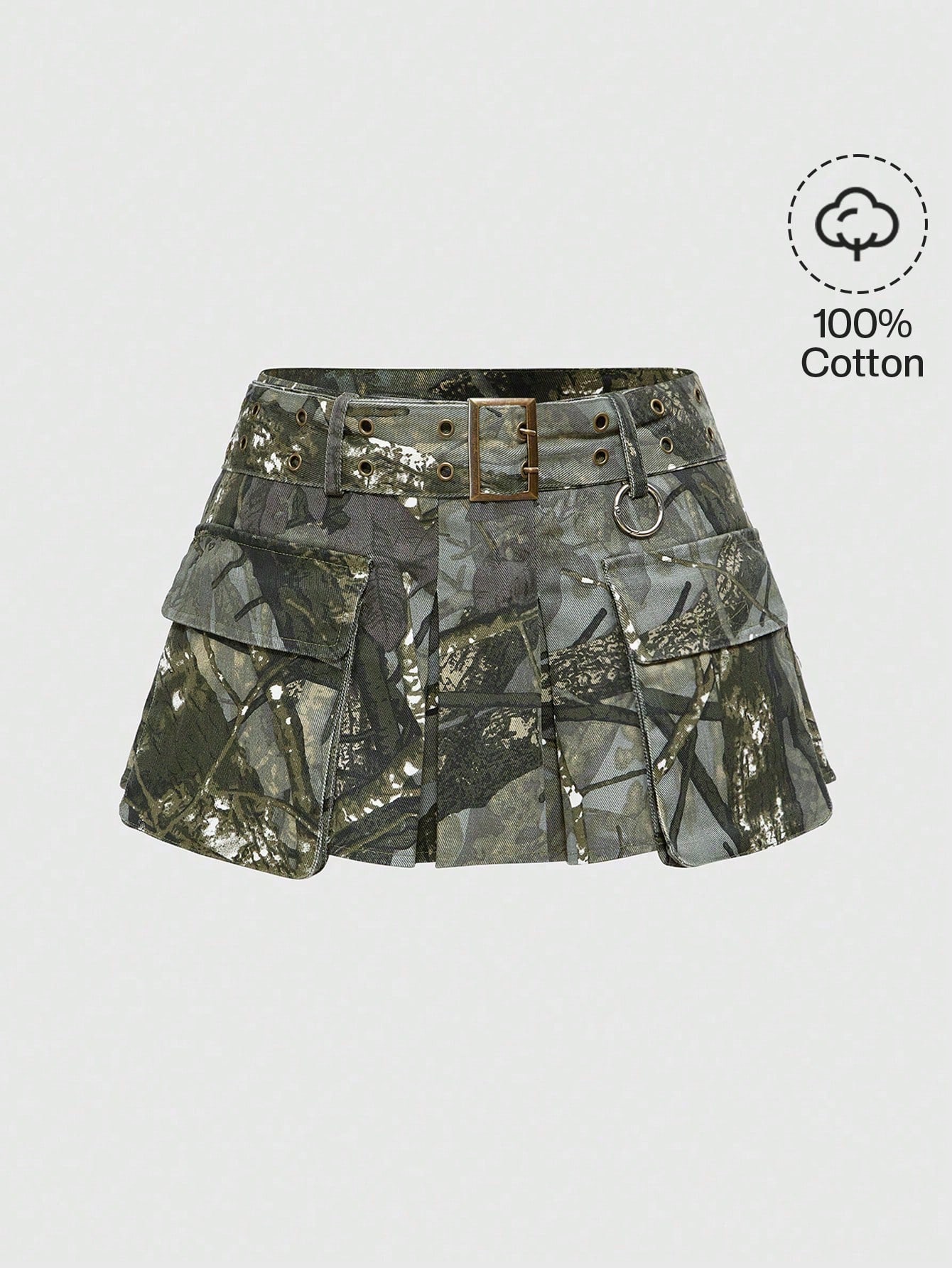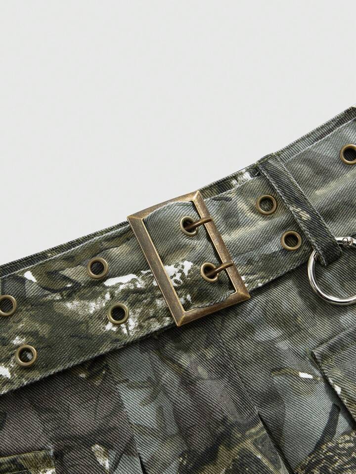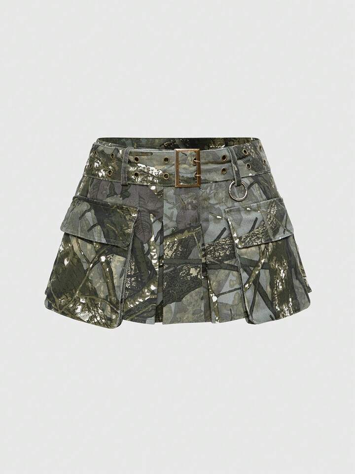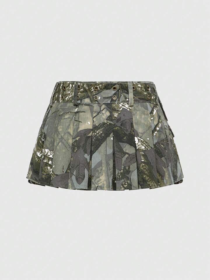 Grunge Punk Minifalda de cintura extra baja con estampado de camuflaje de rama, bolsillos utilitarios y pliegues, en estilo punk apocalíptico, para mujer