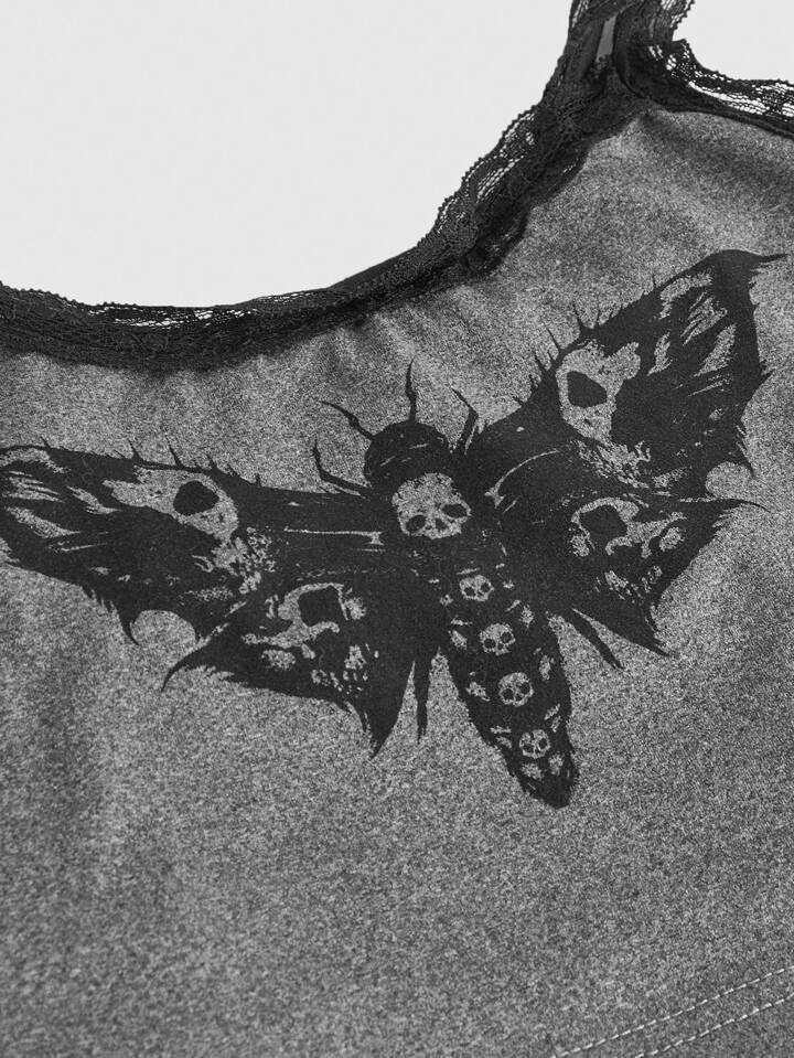 Grunge Punk Top de tipo camiseta con cordones con estampado de mariposas y calavera, para la escuela