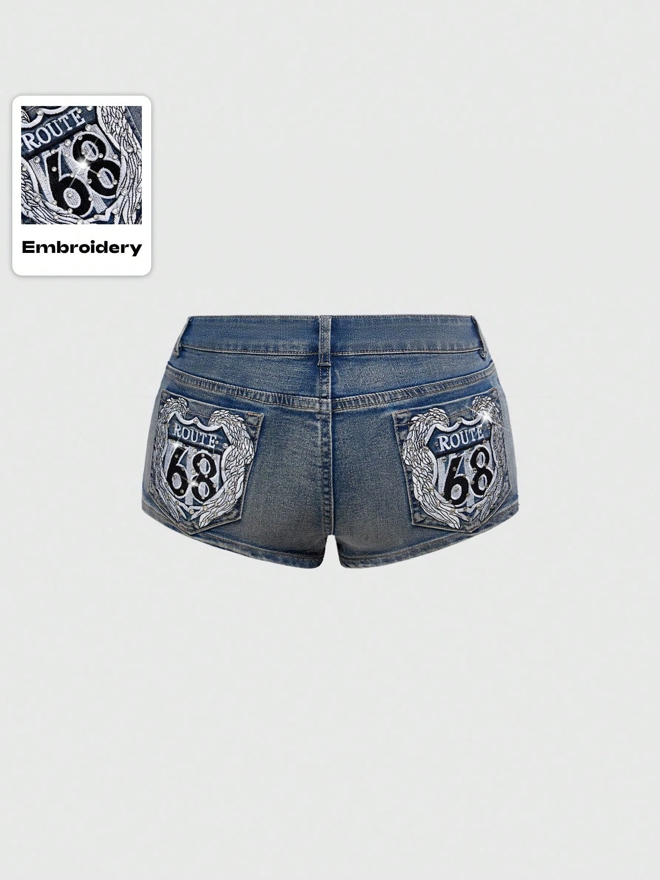 Grunge Punk Short mini de mezclilla con cintura súper baja, bordados de alas y pedrería para mujer, estilo "California Girl" sexy