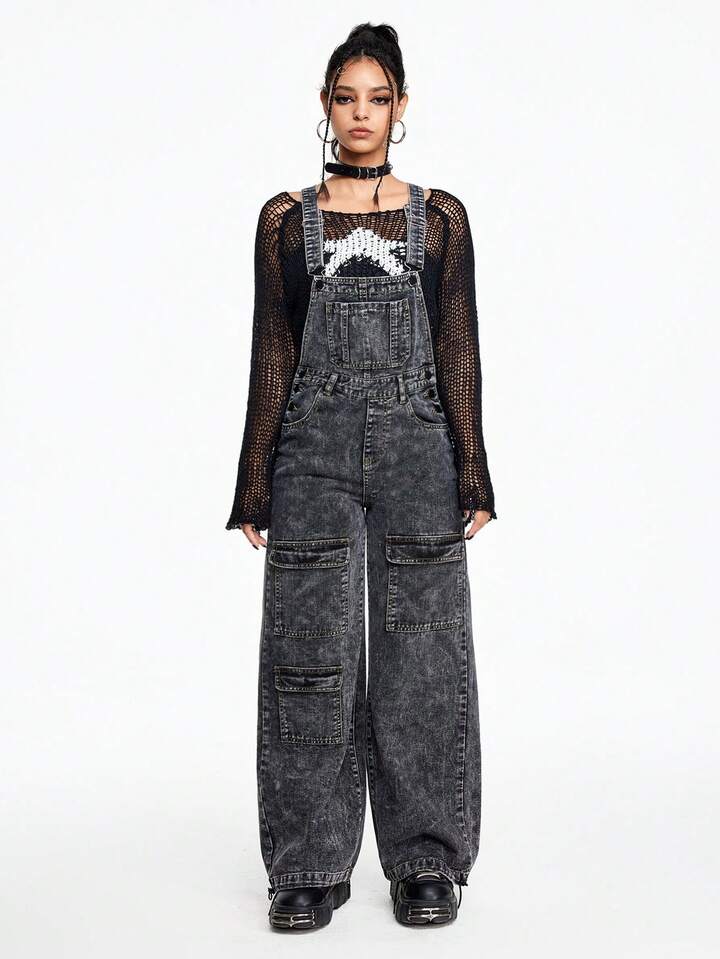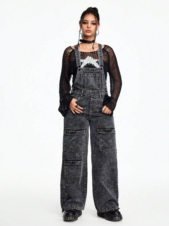 Grunge Punk Peto vaquero de mujer con lavado desgastado y bolsillos 3D en color casual, adecuado para combinar con blusas y camisas en otoño/invierno