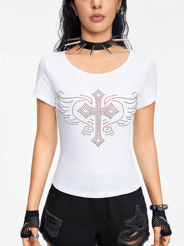 Grunge Punk Camiseta casual de mujer de corte ajustado con cuello bajo, elástica, con patrón de cruz y ala de diamantes de imitación