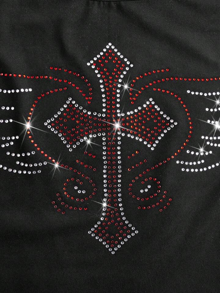 Grunge Punk Camiseta elástica de ajuste ceñido con decoración de cruz y alas con rhinestones, casual, para la escuela