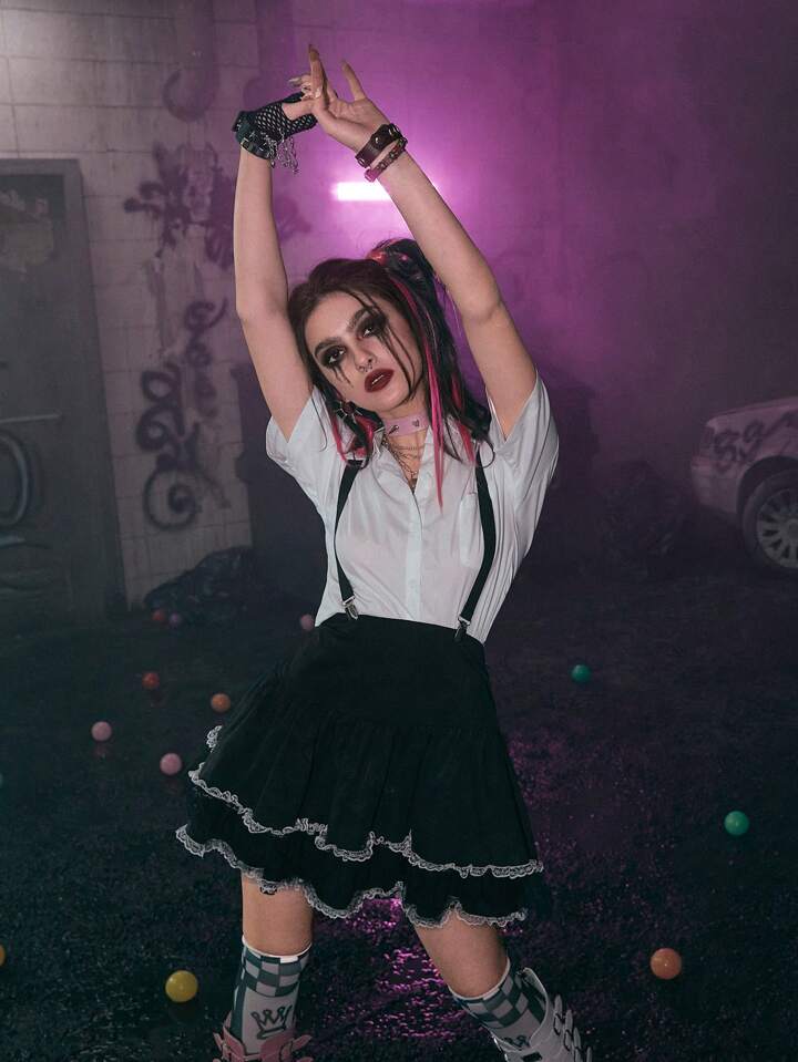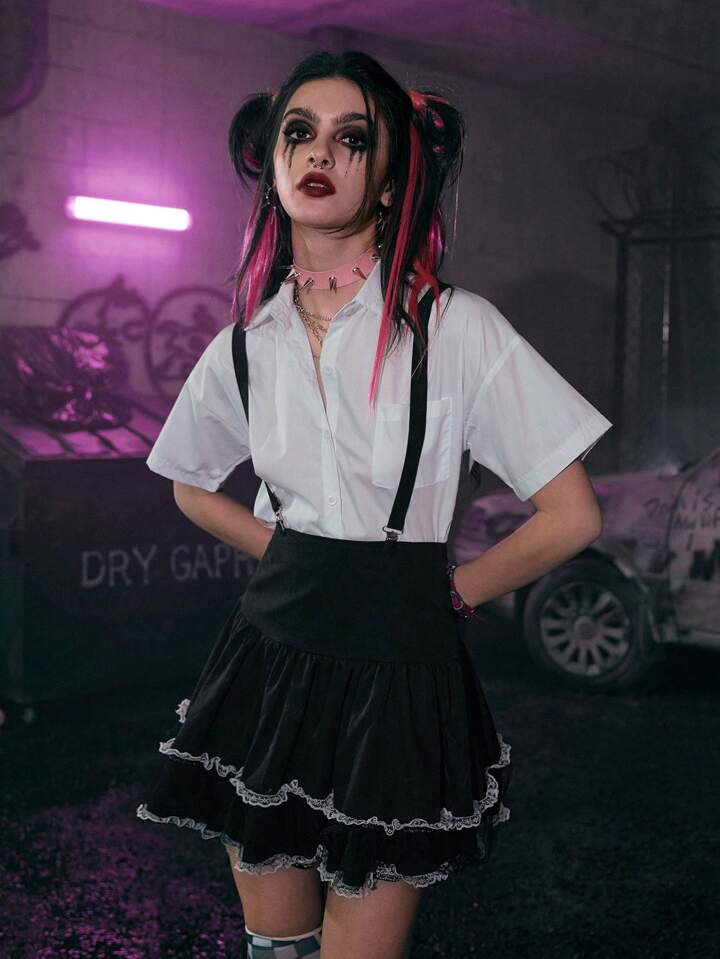 Grunge Punk Falda pichi con encaje en contraste bajo con fruncido