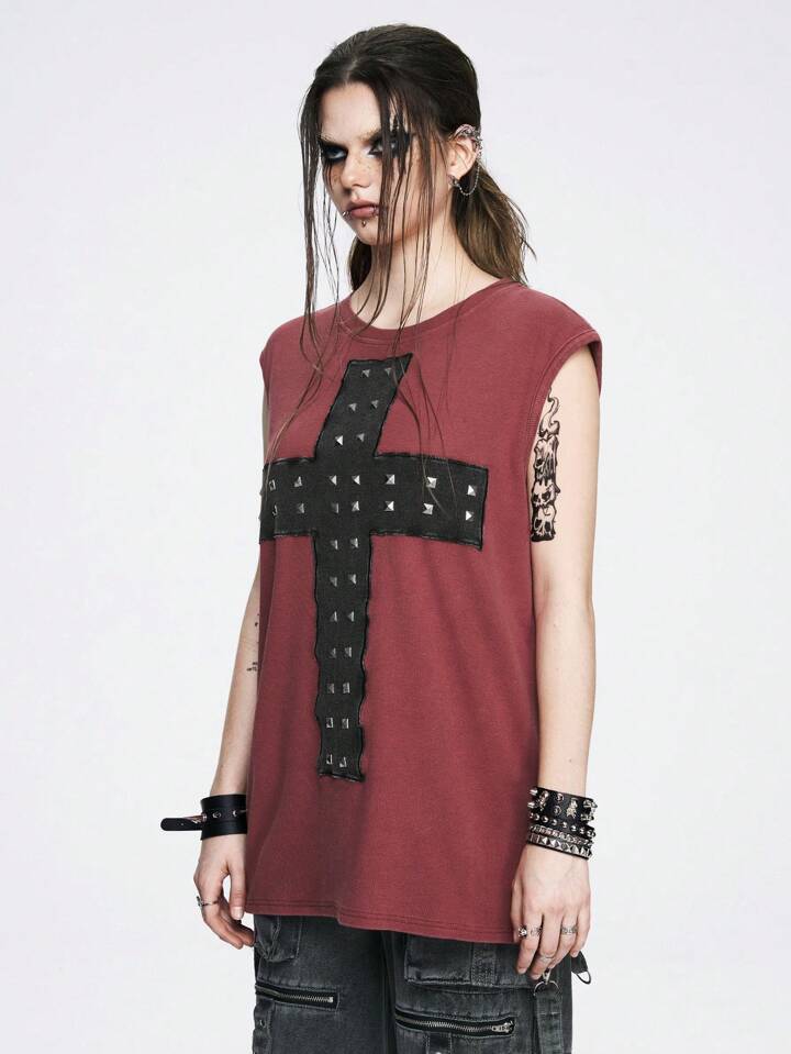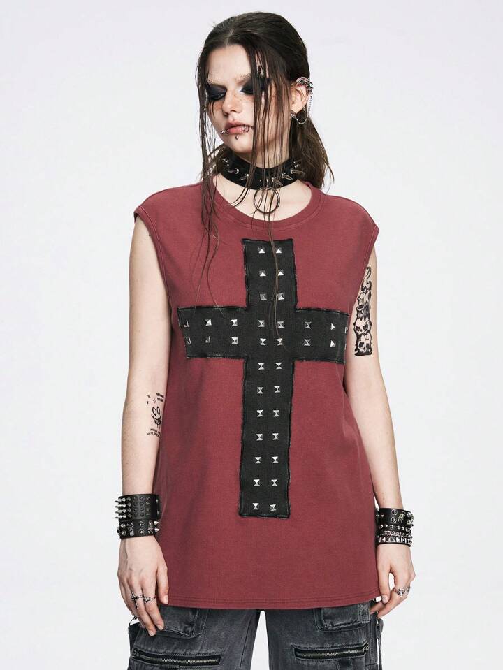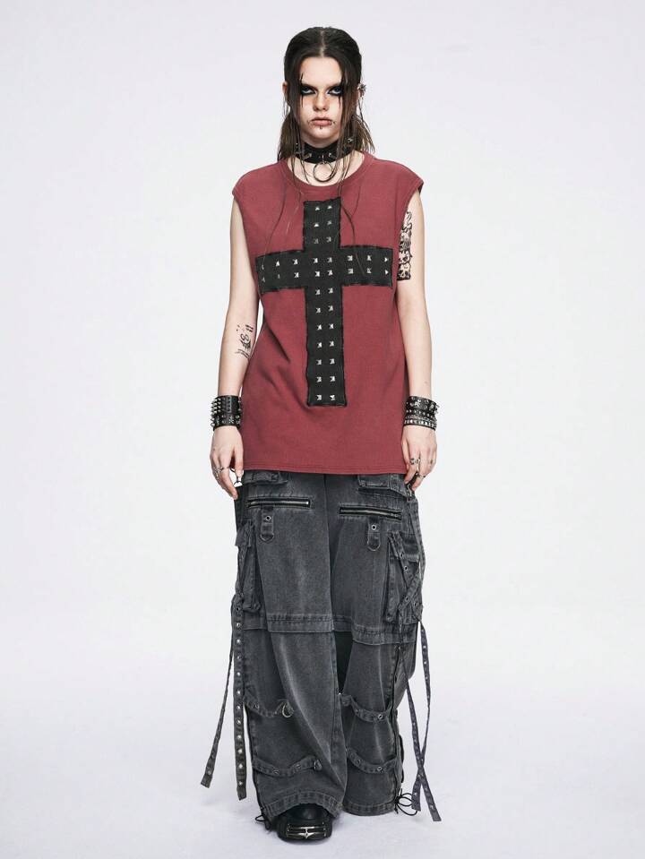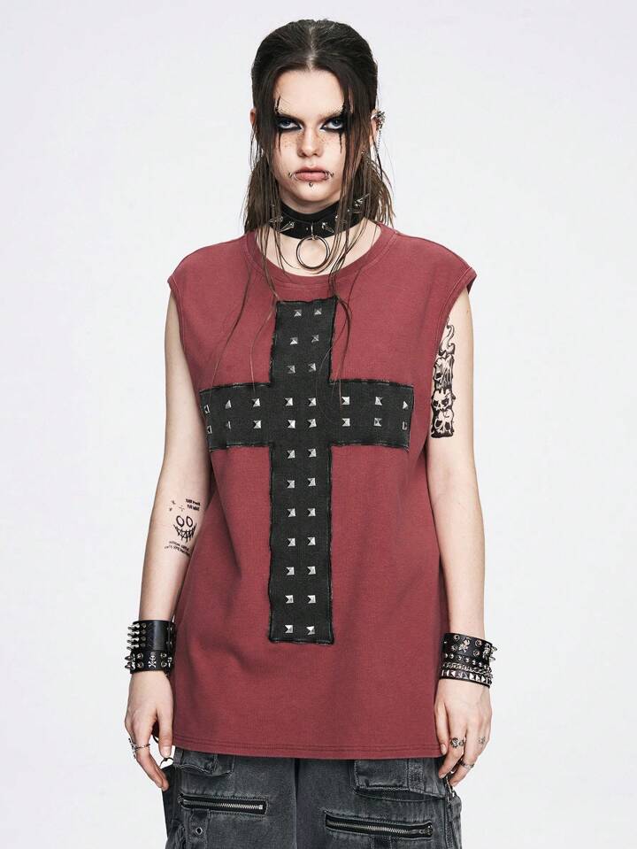 Grunge Punk Elegante camiseta sin mangas roja lavada con efecto nieve, estilo callejero, con corte holgado para mujeres y accesorios de cruz y tachas de metal