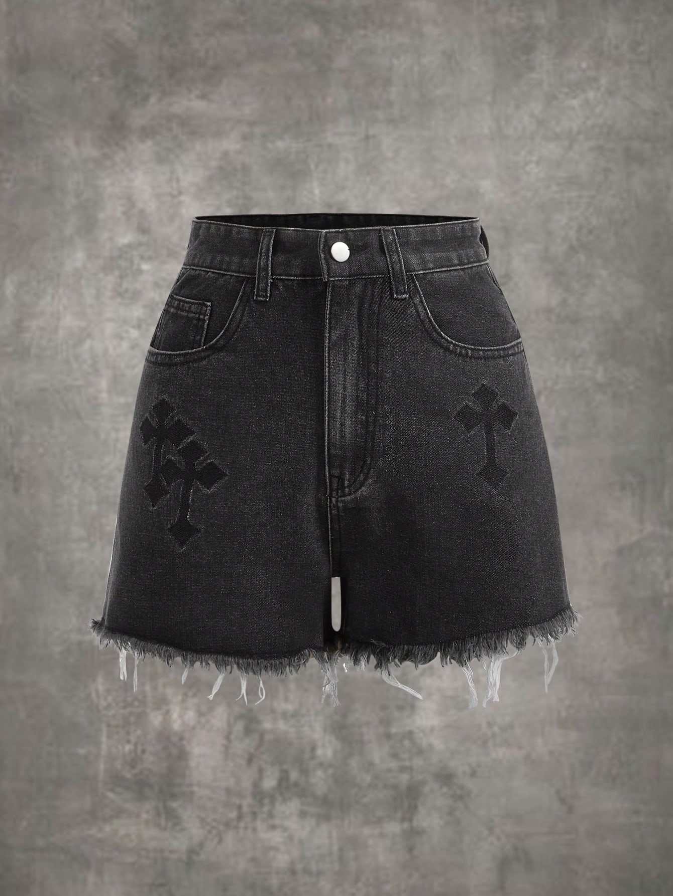 Grunge Punk Shorts en mezclilla cruzado con bordado bajo crudo